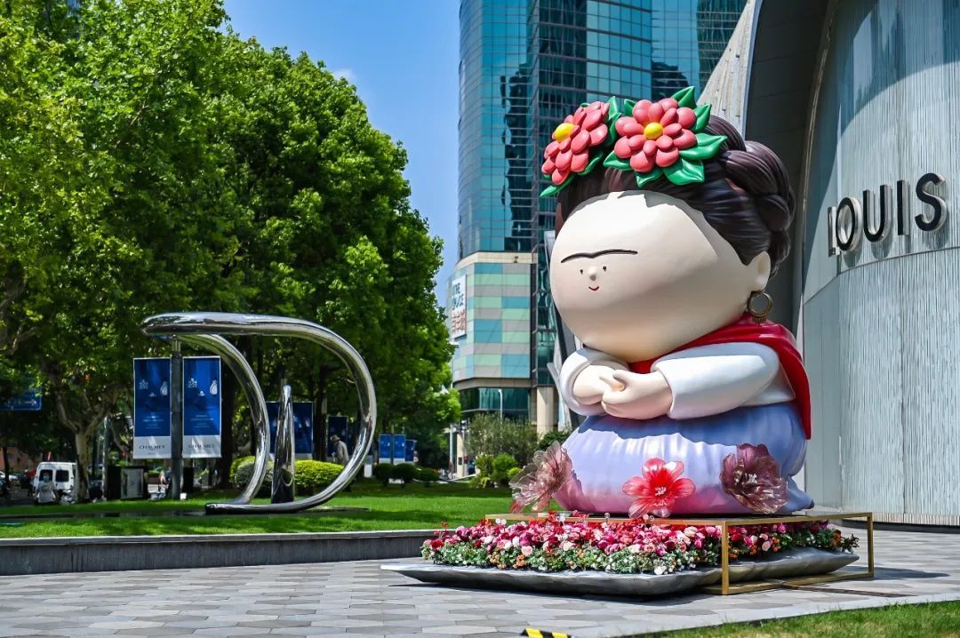 走近尚嘉中心,记者马上就被位于商场楼下遵义路户外广场的大型“萌物”吸引了目光——弗里达雕塑、充满生命力的植物、颜色极致的花簇,构建出一个燃烧生命般充满热情的空间。这处“弗里达的花园”展区,不仅适合拍照打卡,还能通过热情的艺术,了解女画家弗里达充满传奇的艺术人生。