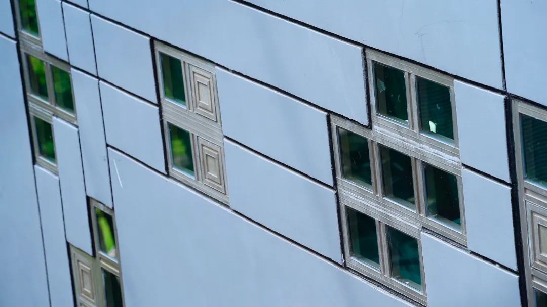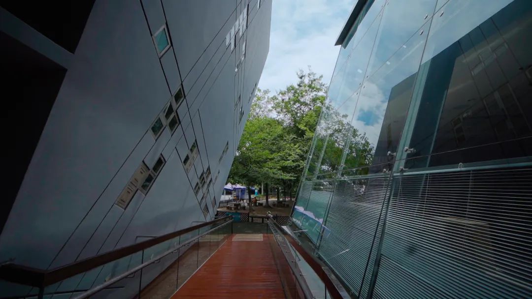 两半间由板块水泥浇注,底部腾空,玻璃幕墙与水泥墙面虚实相间,映衬着周边的环境。