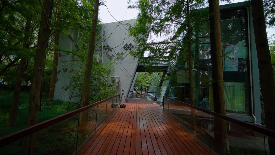设计师天马行空的想象,不同建筑材料的巧妙应用,在周围植物的映衬下,使得两半间成为了园内的最美建筑。