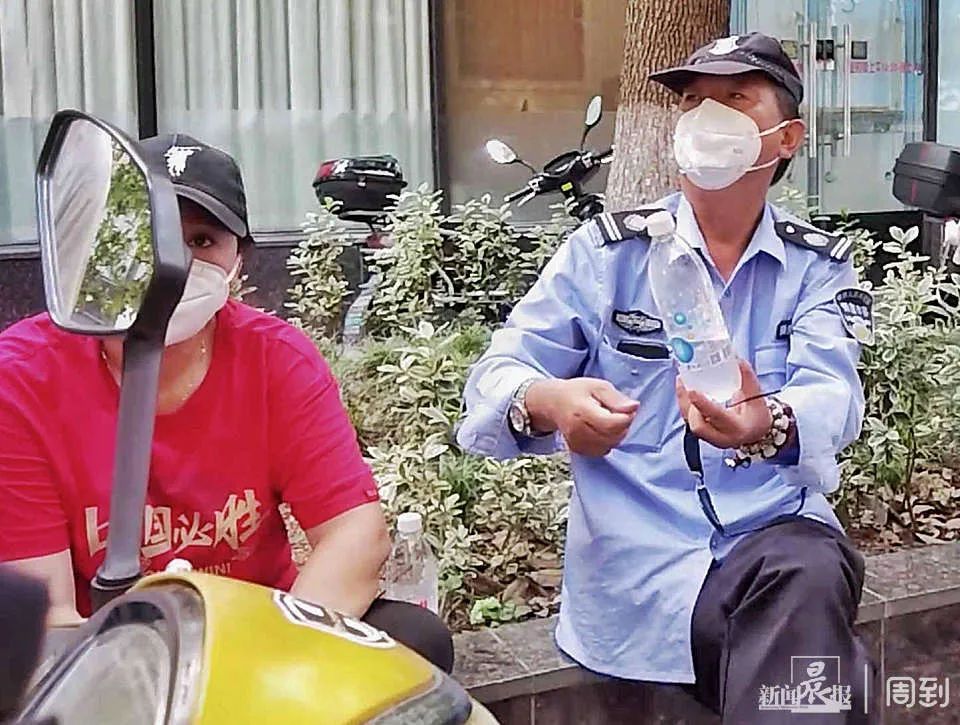 因为当时正处于正午,气象台已发布高温黄色预警,即使是仅仅在站点之间骑行穿梭的记者,也能够明显感觉到,这些站点提供的空调和冰水,对防暑降温起到了极大帮助。