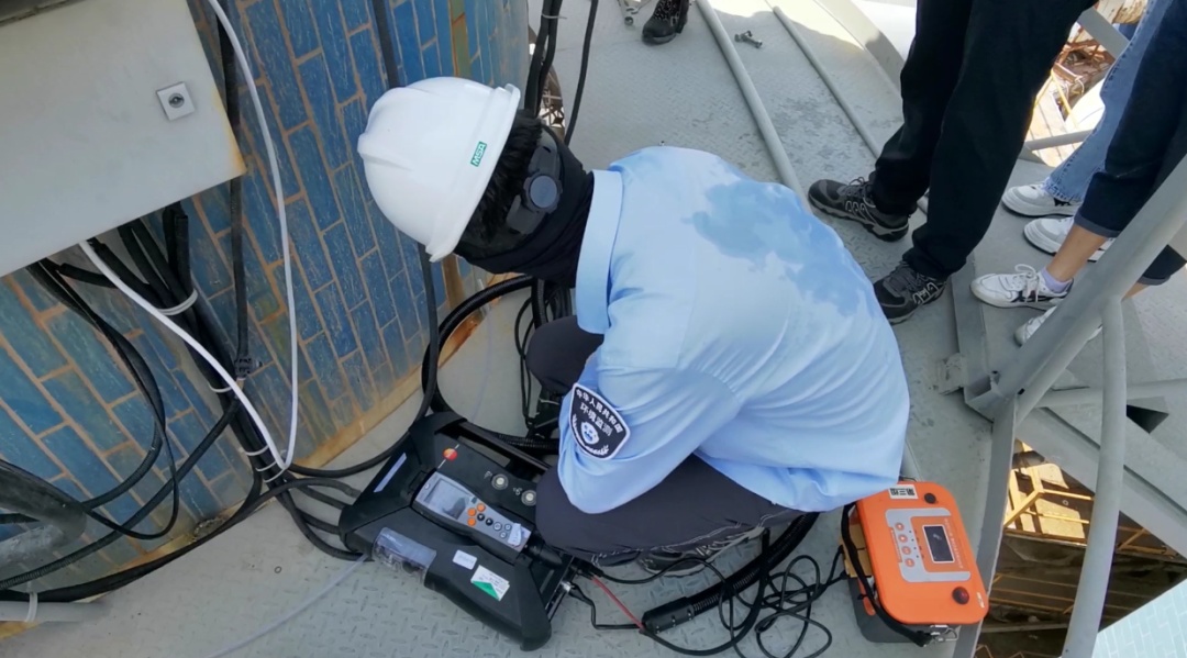 金山区环境监测站工作人员邵家杰说:“在上面采样时,我们一直处在高强度的工作之中,一时之间感觉不到那么热,但等到采样结束返回地面时,会觉得特别热,正常进行检测大概需要一个半小时,如果有特殊情况出现,就会在上面待两三个小时,甚至更久。”