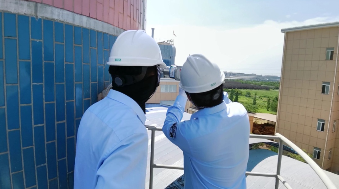 戴好安全帽,提上装备,工作人员准备去采样。但30米的高度,即便是普通的楼梯都爬起来非常吃力,更何况现场的楼梯不仅窄小,而且坡度也很陡,有时还需要穿过一些狭小的通道。滚烫的铁质扶手,更是让人无从下手,无法借力。