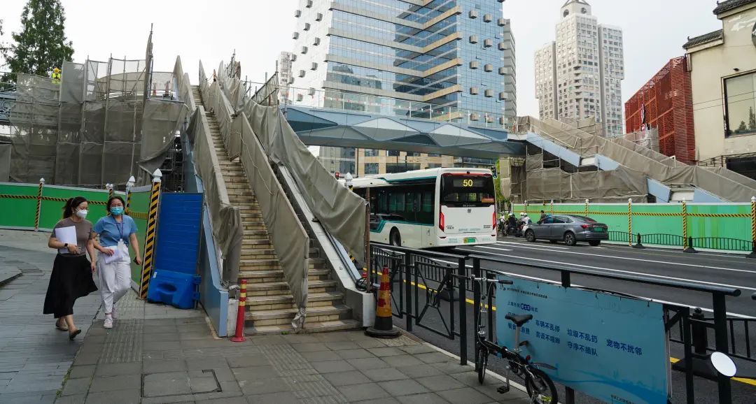 记者了解到,在疫情前,该工程已完成天桥两侧电动扶梯基础、钢立柱基础、钢楼梯基础的浇筑、北侧钢楼梯的安装,以及肇嘉浜路宛平路西北侧的样洞开挖、绿化搬迁、电力管线保护、围挡安装、脚手架搭设、信息管线搬迁及通行步道施工,更换了原有桥体装饰面板及其配套龙骨,对原有钢结构进行了除锈油漆涂刷。当前,工人们正在全力奋战抢夺工期,对吊装的自动扶梯进行为期约10天的零部件安装和运行调试工作。