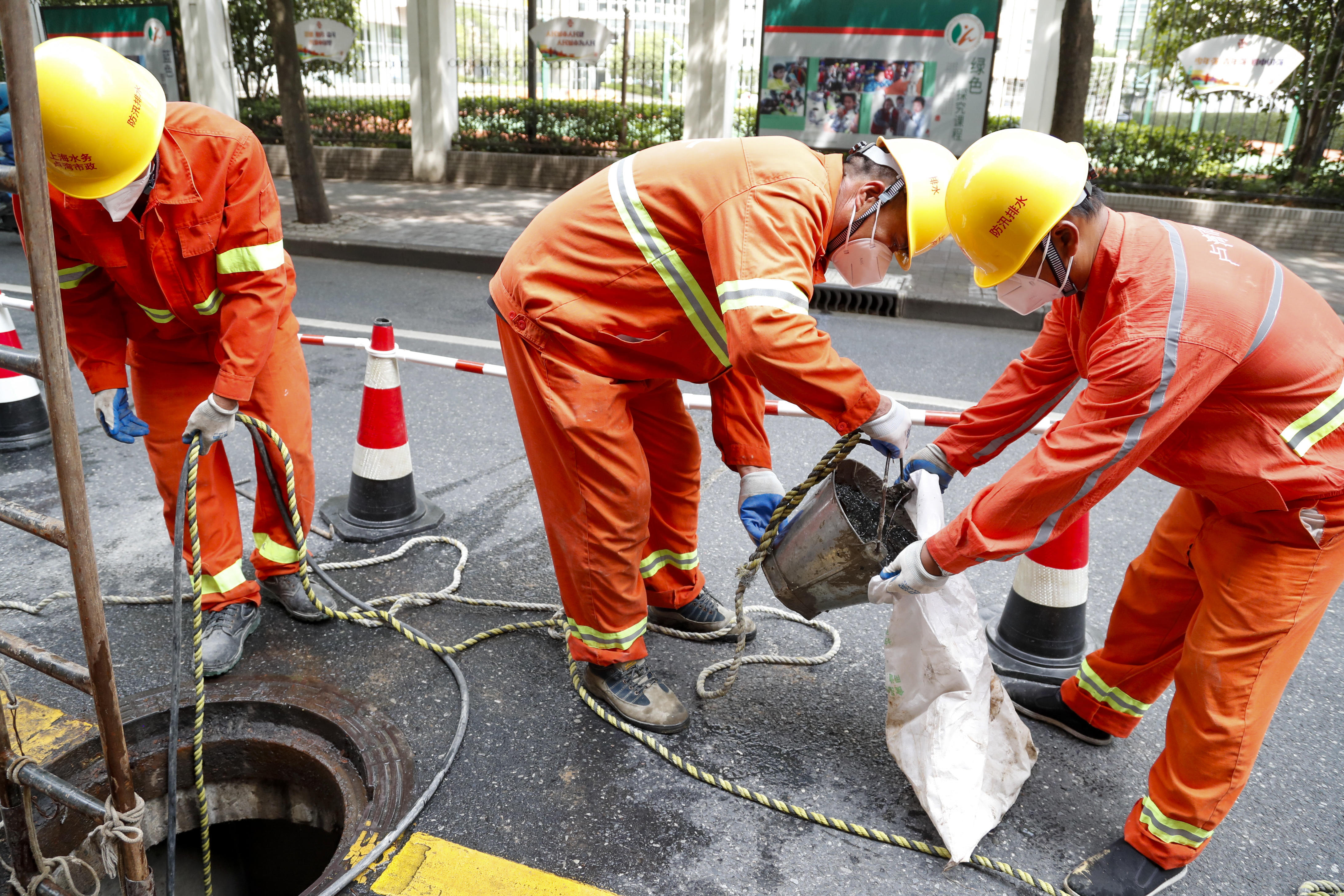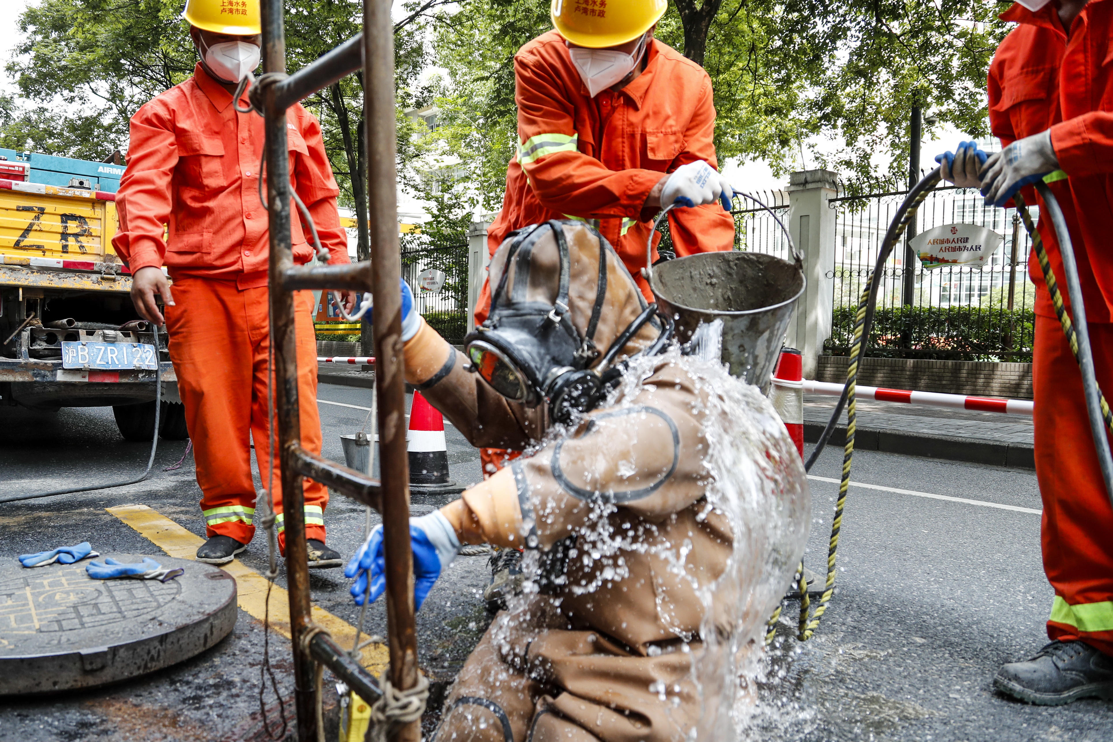 “目前卢湾市政承担着原卢湾区域下水道的管道养护工作。考虑到夏天高温,每天早上6点开始疏通,下午15点左右作业,避开中午最炎热的时段。”潜水员负责人杨东平介绍道:“虽然现在下水道养护机械化水平不断提升,但是遇到像高液位大口径管网养护等难点问题还是需要蛙人下井作业。他们穿着潜水服,在水下作业出的力气是在路面上的几倍。现在天气太热了,我们潜水员每次上来,都得呆上好一会儿,才能缓过来。”