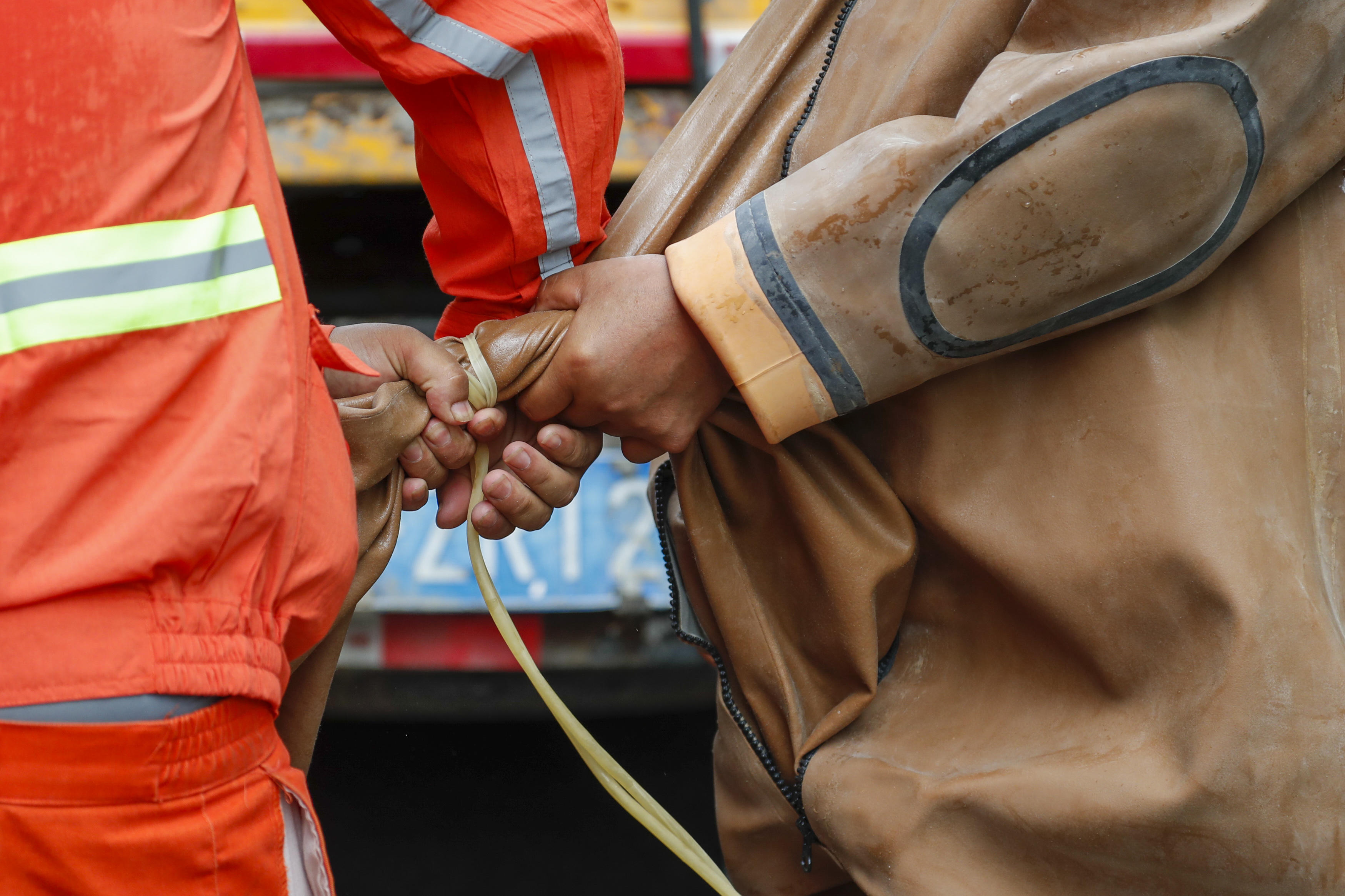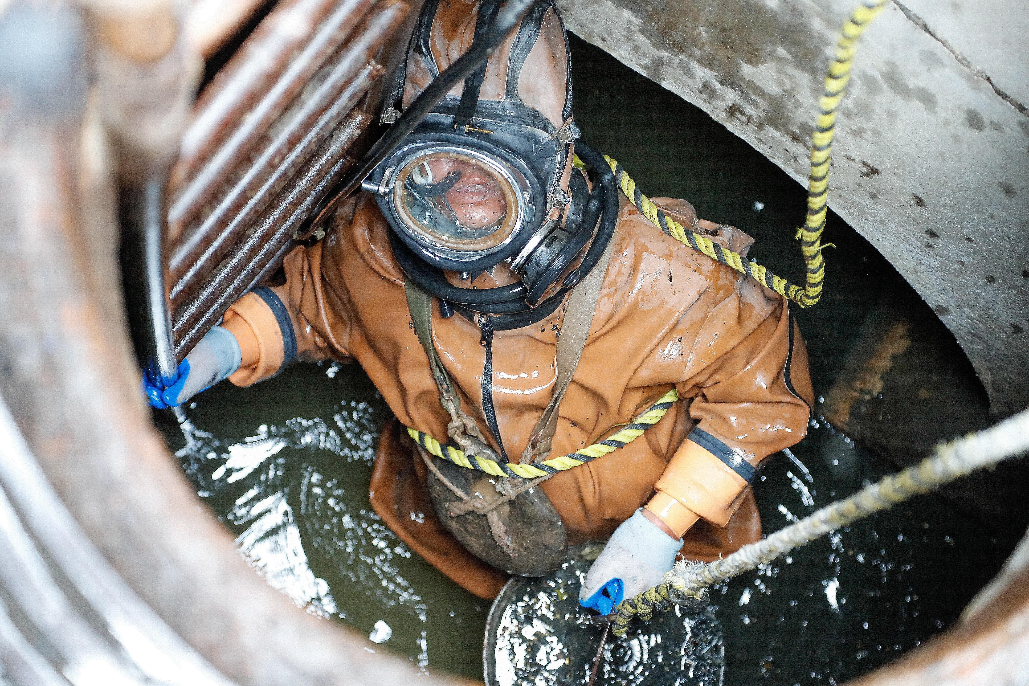 这次作业,难度不大。钟连华下井后半小时,就顺利完成了水底清淤,给出了出水信号。“今天这个管道积泥量不多,也没啥味道,但井下其实很危险,会有有害气体,所以下去前先要用有毒有害检测仪检测。下面还有水流、暗流、泥浆等,可能会把人冲走,所以我得带上保险绳,背上铅饼。“钟连华脱下潜水服,浑身湿漉漉的,本以为这是潜水服进水,但他却说是汗水打湿的。“潜水服是不会进水的,我这一身潜水服就相当于穿了一件大棉袄,胶质材质穿的时候就很费力,假如外面30°C的话,衣服里能到45~50°C,到了井下体感更闷热,身体更容易出汗。”说话间,大颗大颗的汗珠顺着他的脖子淌下,橙色的工作服已全部湿透。