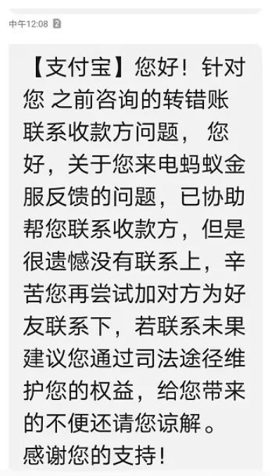 而在尝试与这位“135”开头的支付宝账号用户多次联系无果后,支付宝回复称:已协助帮您联系收款方,但是很遗憾没有联系上,辛苦您再尝试加对方为好友联系,若联系未果,建议您通过司法途经维护您的权益。