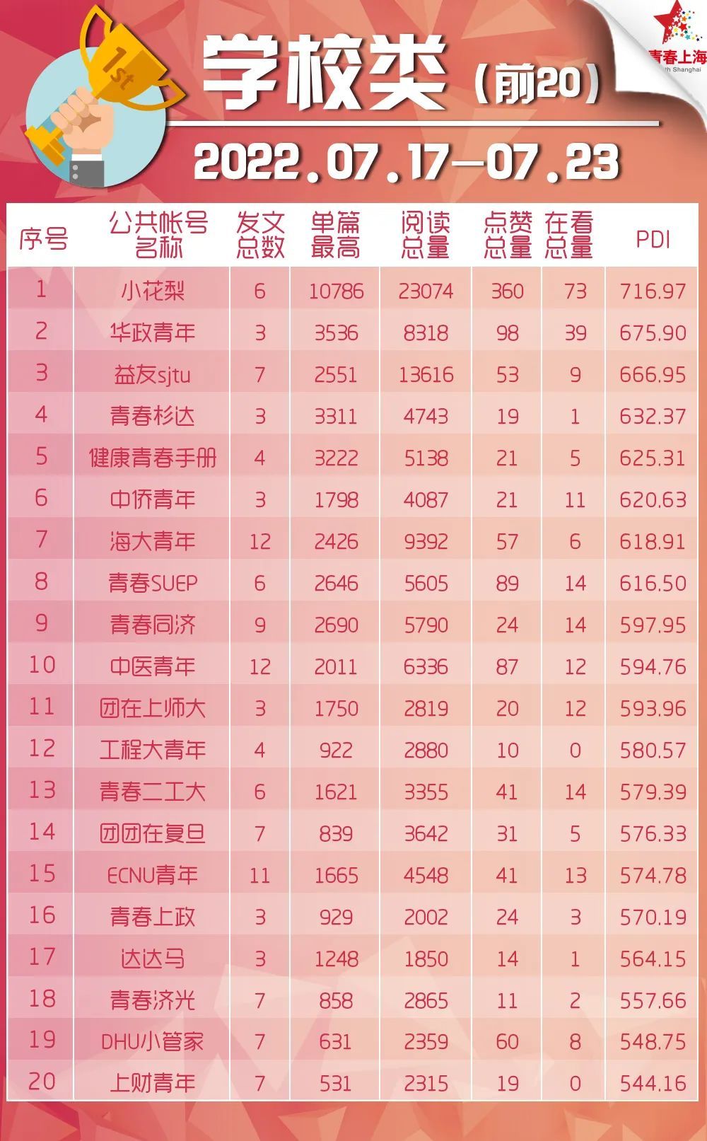 ☆ 此外还有多篇文章登上热文榜,青春SUIBE发布的《不忘初心,未来可期 | 校团委直属部门换届名单公示》、华政青年发布的《一所“云端上的法律学校”即将上线!》、青春杉达发布的《公示 | 上海杉达学院30周年校庆志愿者名单》;庭前独角兽发布的《租房的江湖有多深?| 庭前独角兽》《法律人的演说稿,怎么写?| 庭前独角兽》,用独特的视角、通俗易懂的语言向我们科普了法律知识。