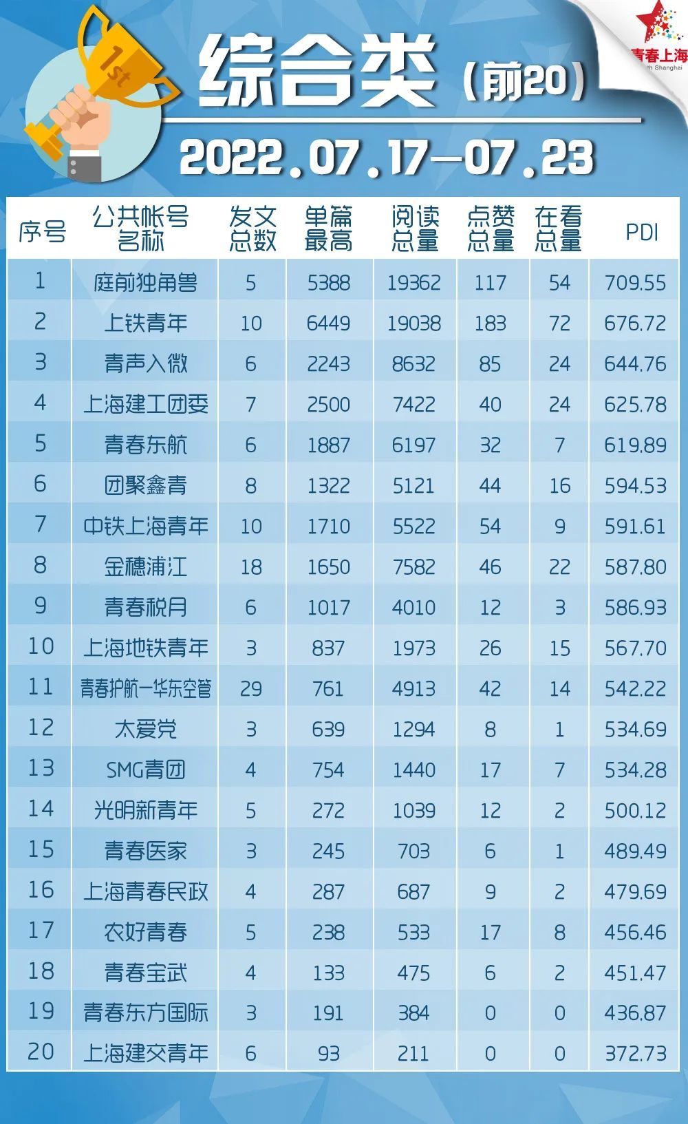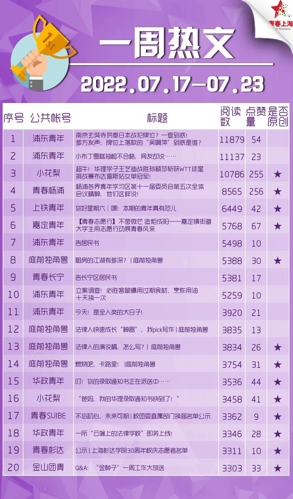 ☆ 有责任,有担当,青春才会闪光。小花梨发布的《超牛!华理学子王艺迪战胜孙颖莎斩获WTT球星挑战赛布达佩斯站女单冠军!》,展现了华理青年在竞技体育上的热血。庭前独角兽发布的《燃烧吧,卡路里!|庭前独角兽》展现了一群从事法律职业的“刘畊宏女孩们”挥洒汗水,感受运动带给她们的悄然蜕变。青春杨浦发布的《杨浦各界青年学习区第十一届委员会第五次全体会议精神,他们这样说!》、上铁青年发布的《你好星期六|嘿!本期的青年真有范儿》、嘉定青年发布的《【青春志愿行】不啻微芒 造炬成阳——嘉定镇街道大学生用志愿行动展青春风采》、金山团青发布的《Q&A:“金种子”一周工作大放送》,无疑都是正能量满满的闪光青年。