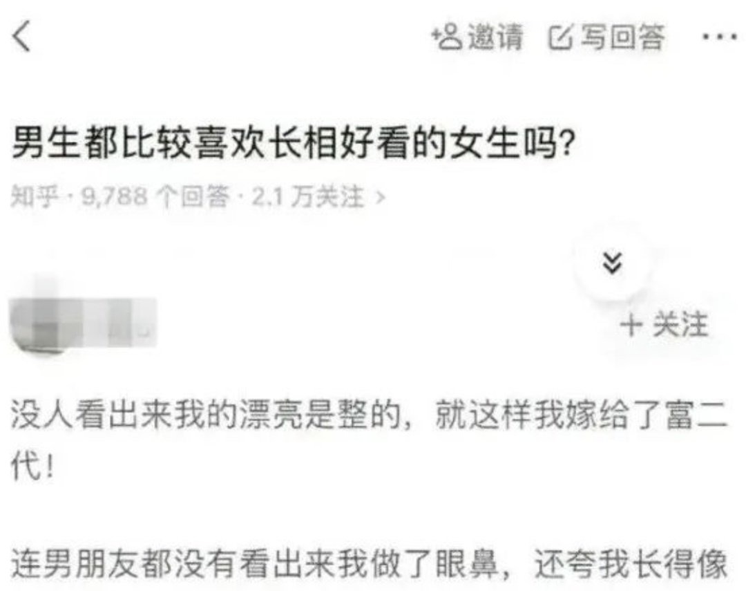 2021年7月,“知乎”平台用户(用户名:十某某)在平台相关问题链接:“男生都比较喜欢长相好看的女生吗?”下添加回答,称“三句话让男人给我花了18W!”,“没人看出来我的漂亮是整的,就这样我嫁给了富二代!”并配上了相关照片。