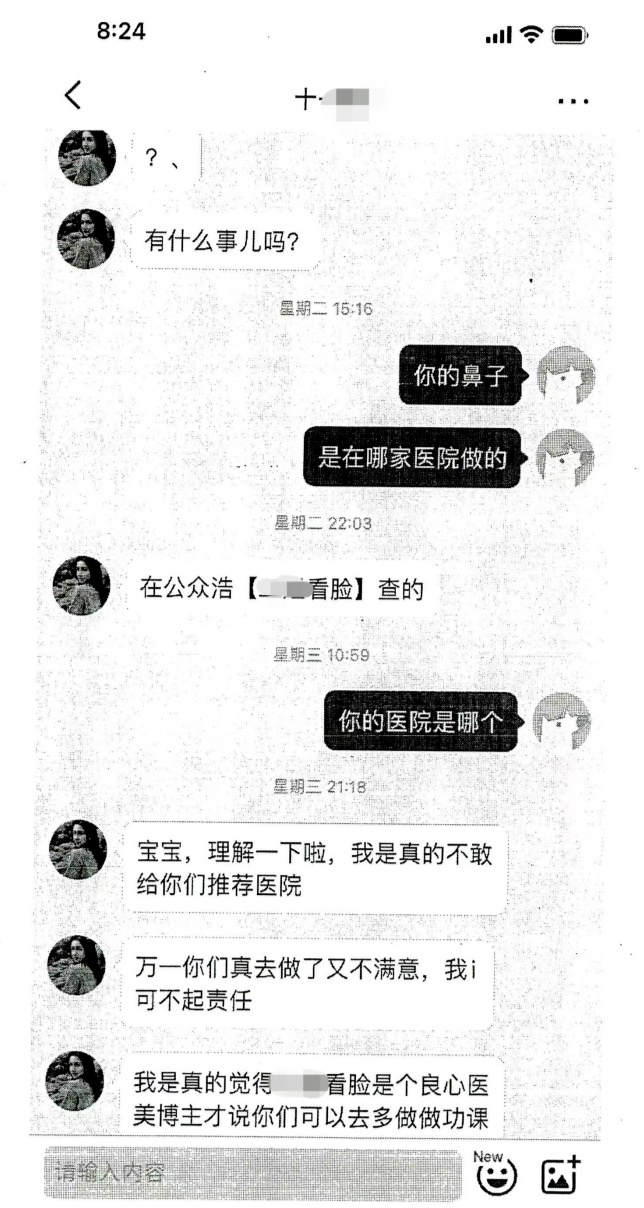 从网上冲浪的同学处了解到该情况后,小晴联系上用户“十某某”,对方表示,是通过微信公众号“XX看脸”及相关医美机构做的。小晴又找到“XX看脸”及客服人员,对方称照片中的女生是自己的客户,眼睛鼻子都是在医美机构做的。