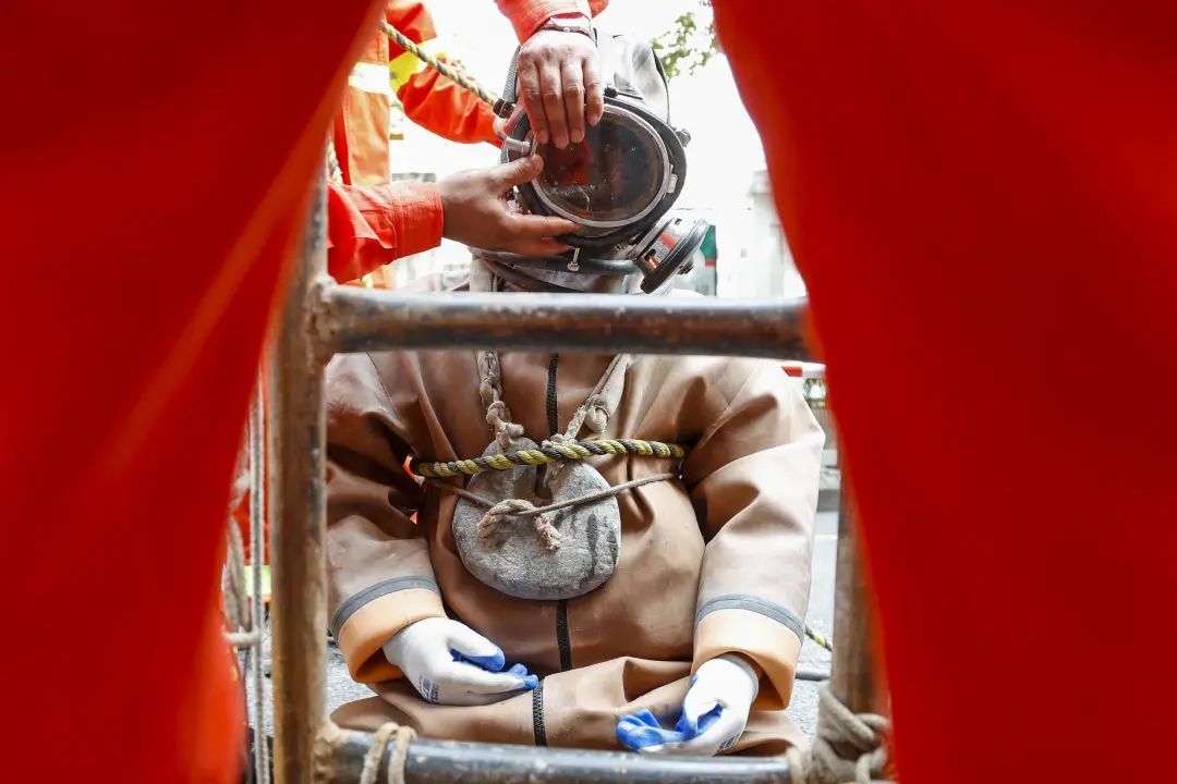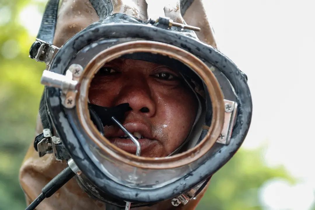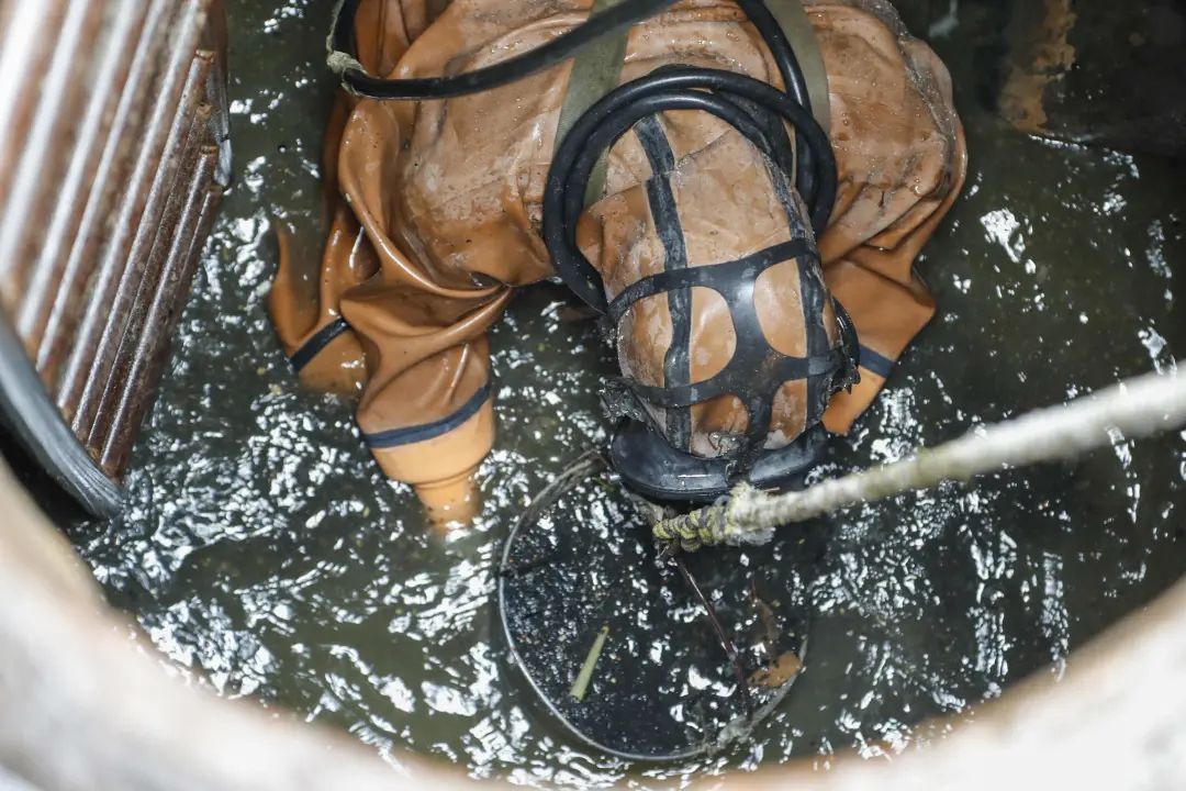 “蛙人”们从事的是城市地下管网的维护工作。工作时,他们需要穿着厚重的潜水服在狭小的污水井里进行作业。