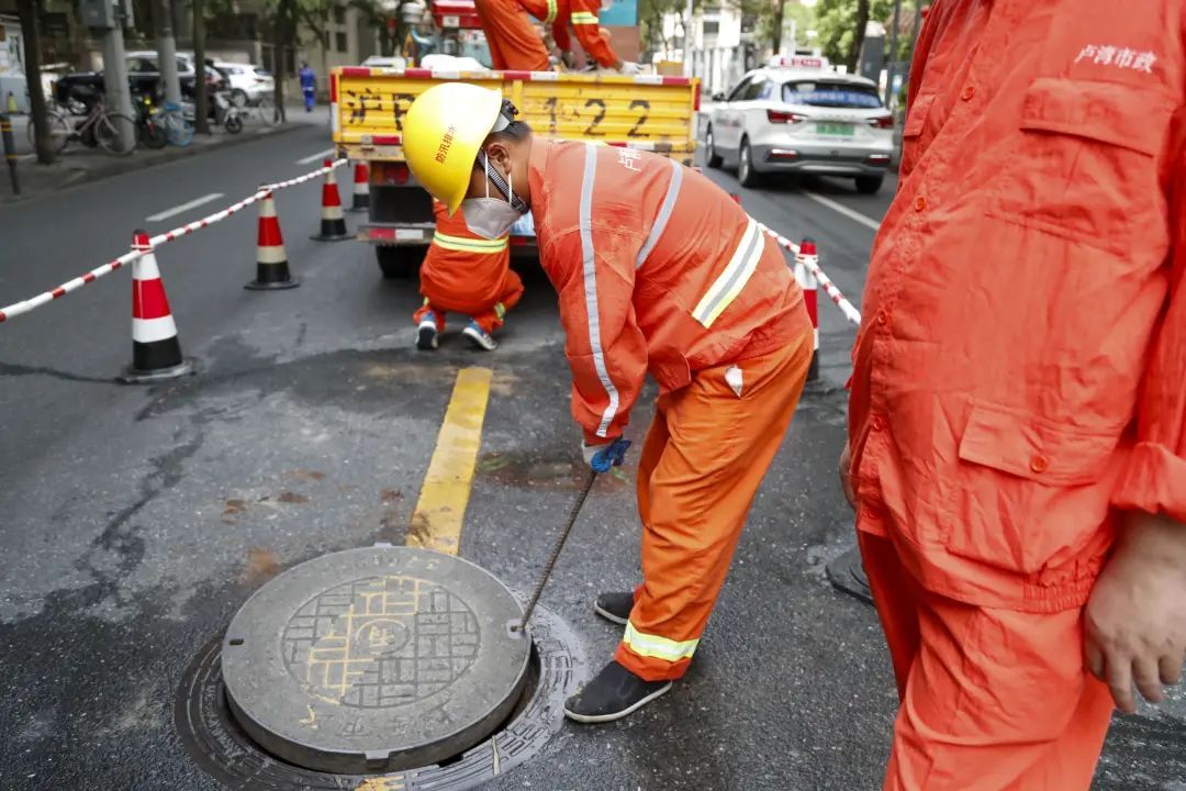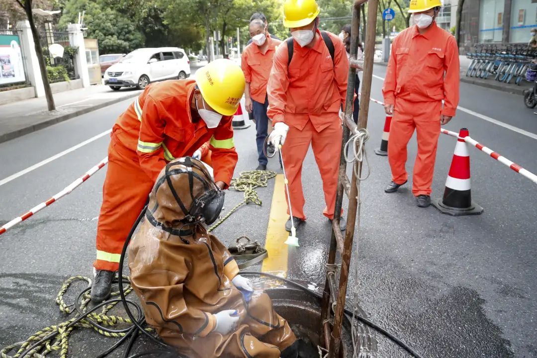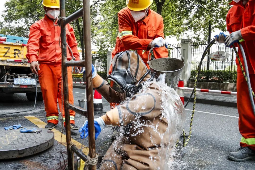 “目前卢湾市政承担着原卢湾区域下水道的管道养护工作。考虑到夏天高温,每天早上6点开始疏通,下午15点左右作业,避开中午最炎热的时段。”潜水员负责人杨东平介绍道:“虽然现在下水道养护机械化水平不断提升,但是遇到像高液位大口径管网养护等难点问题还是需要蛙人下井作业。他们穿着潜水服,在水下作业出的力气是在路面上的几倍。现在天气太热了,我们潜水员每次上来,都得呆上好一会儿,才能缓过来。”