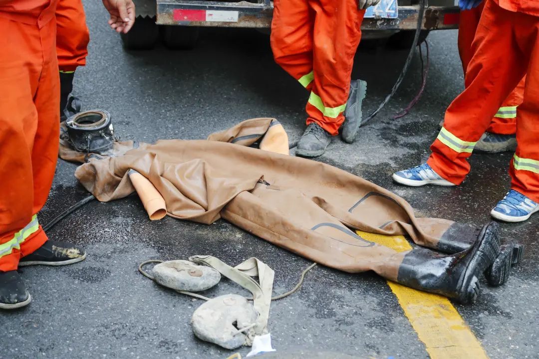 钟连华脱下潜水服,浑身湿漉漉的,本以为这是潜水服进水,但他却说是汗水打湿的。“潜水服是不会进水的,我这一身潜水服就相当于穿了一件大棉袄,胶质材质穿的时候就很费力,假如外面30°C的话,衣服里能到45°C~50°C,到了井下体感更闷热,身体更容易出汗。”说话间,大颗大颗的汗珠顺着他的脖子淌下,橙色的工作服已全部湿透。