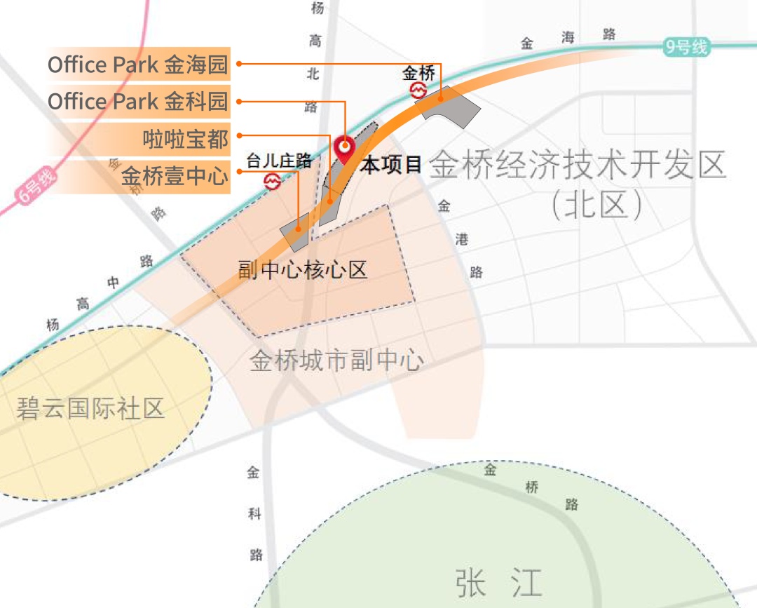 Office Park金科园紧邻金桥城市副中心核心区,与西侧的“金桥壹中心”、南侧的“啦啦宝都上海金桥”、以及东侧的“Office Park金海园”项目遥相呼应。
