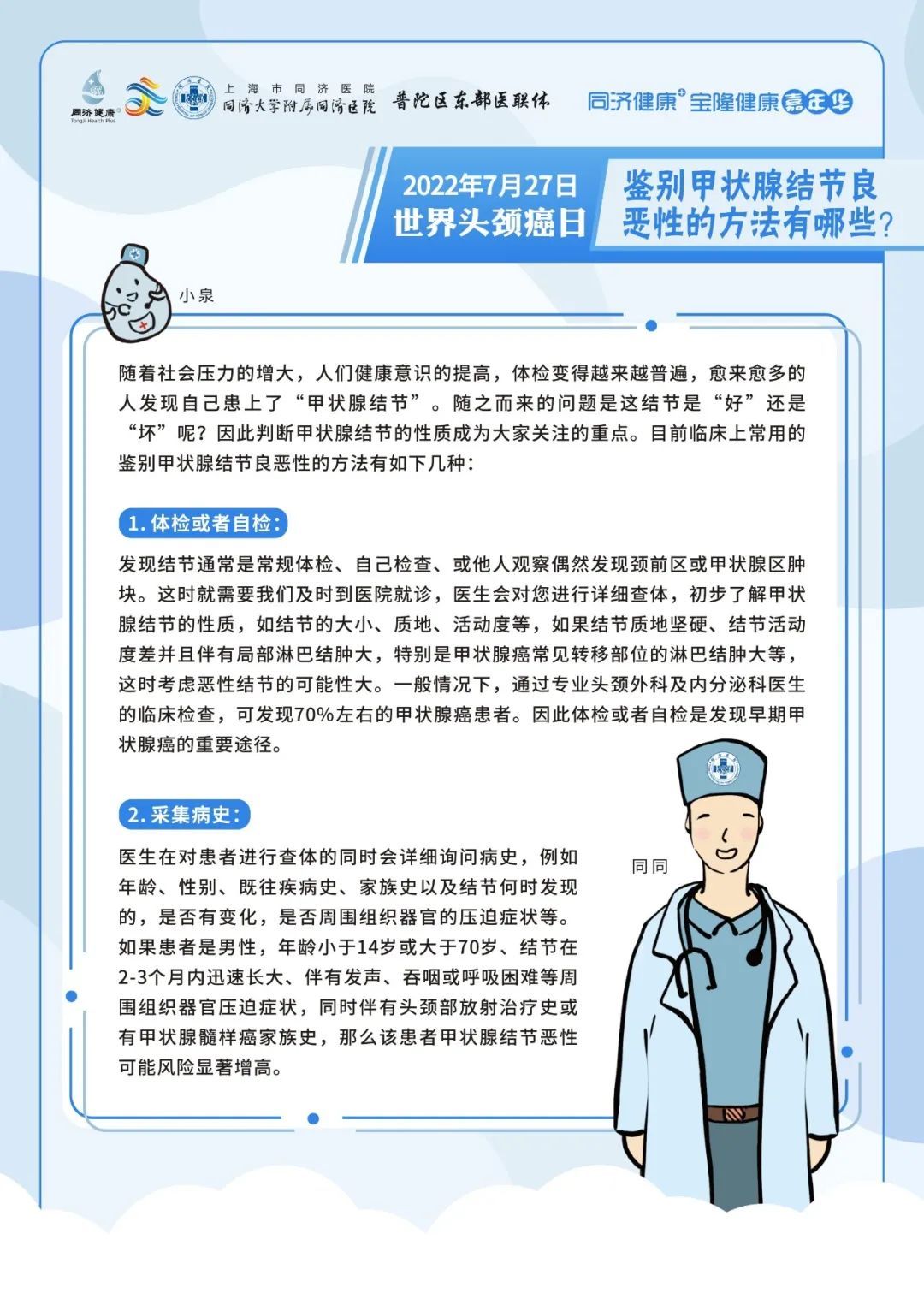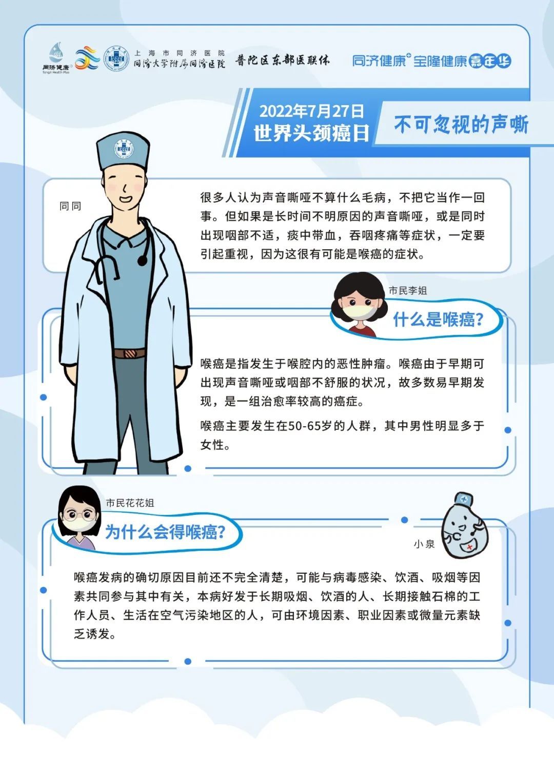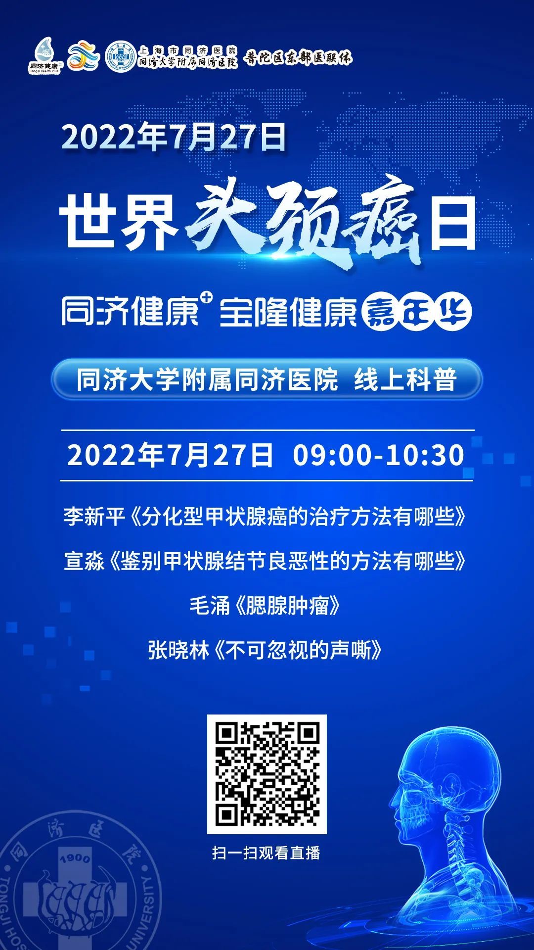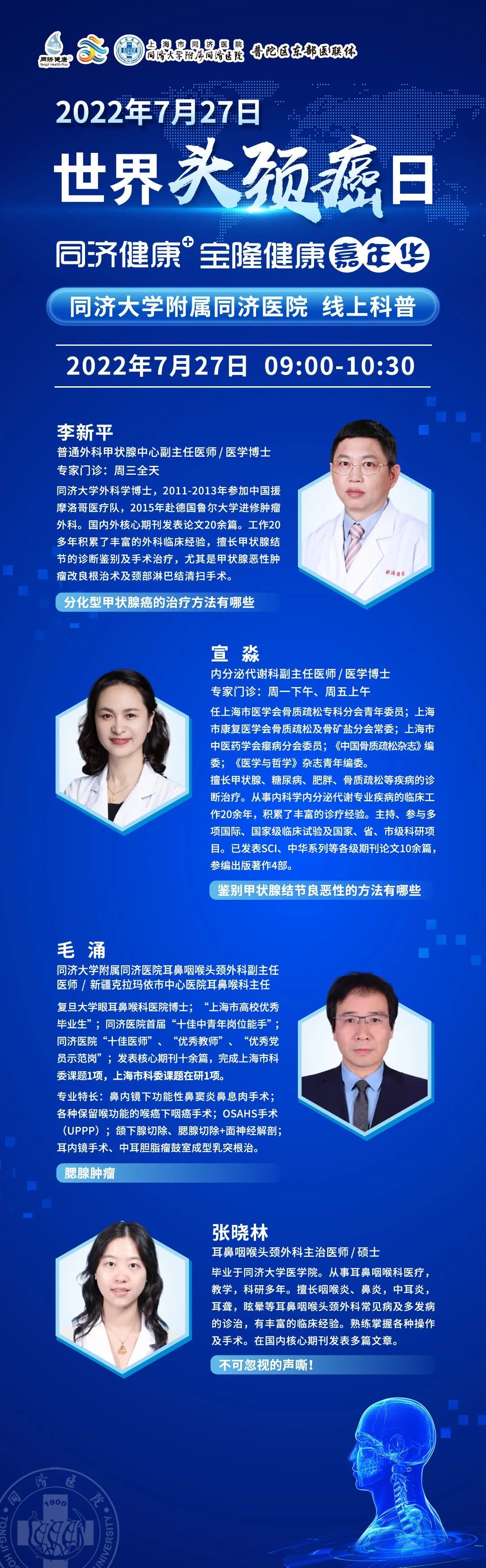 上海市同济医院普通外科甲状腺中心、内分泌代谢科、耳鼻咽喉头颈外科将于2022年7月27日上午9:00在线上联合开展专家科普活动,为大家带来头颈癌的相关科普,希望能对大家有所帮助。