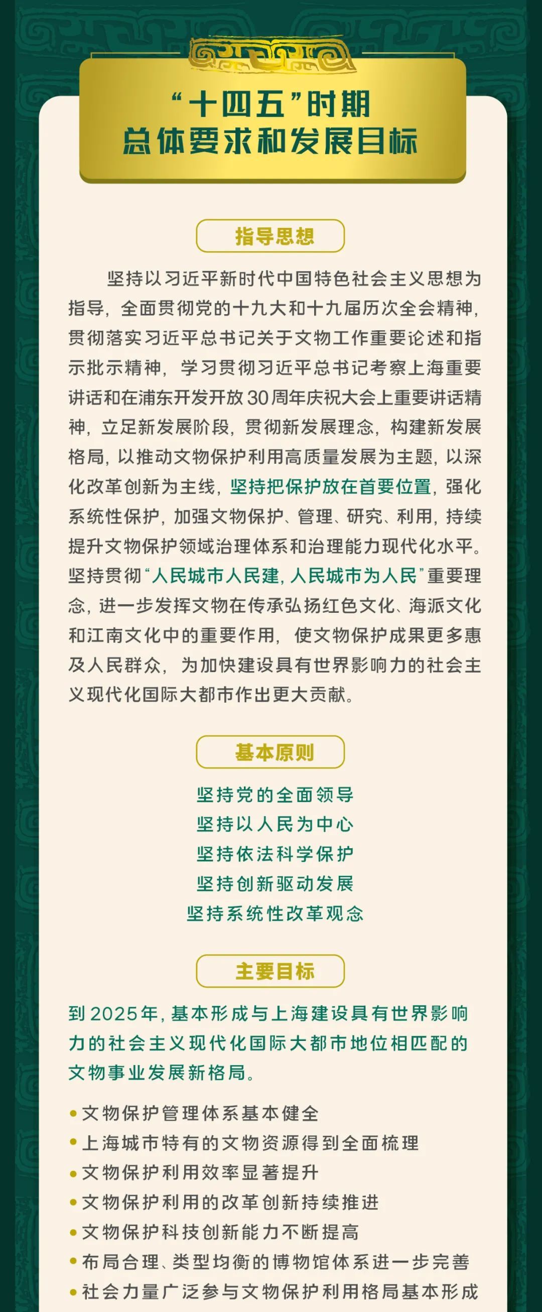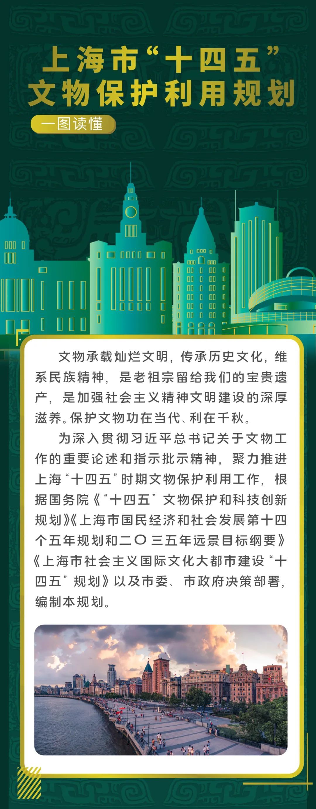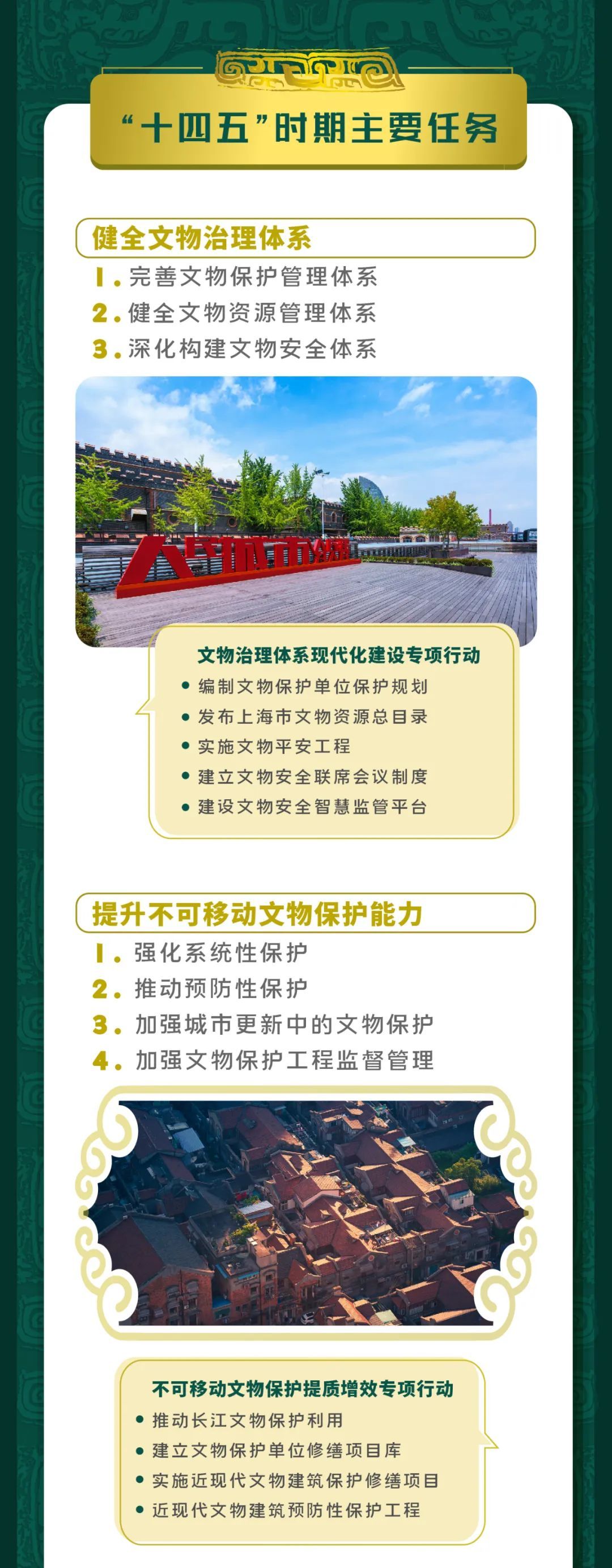 市文化旅游局出台了《上海市“十四五”文物保护利用规划》。《规划》指出到2025年,基本形成与上海建设具有世界影响力的社会主义现代化国际大都市地位相匹配的文物事业发展新格局。明确健全文物治理体系、提升不可移动文物保护能力、加强革命文物和红色资源保护利用等八大主要任务。具体详见↓