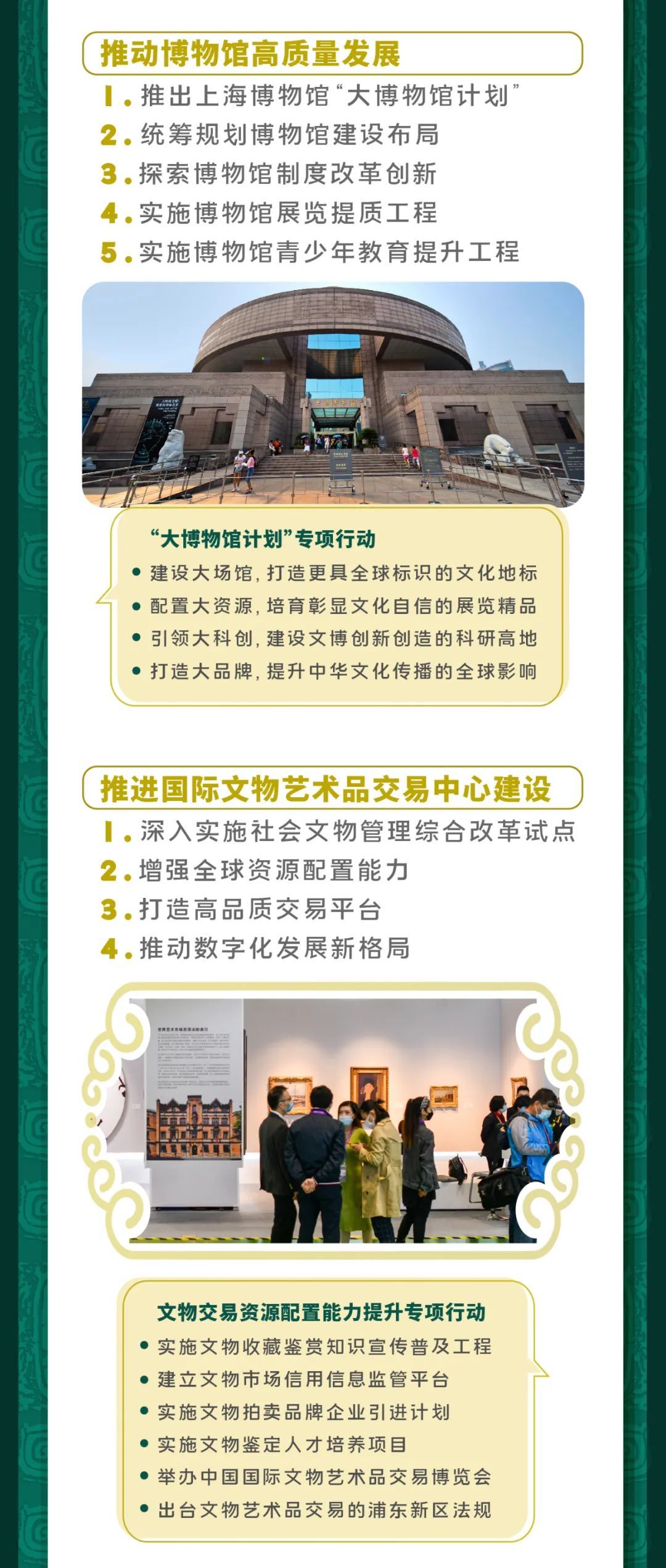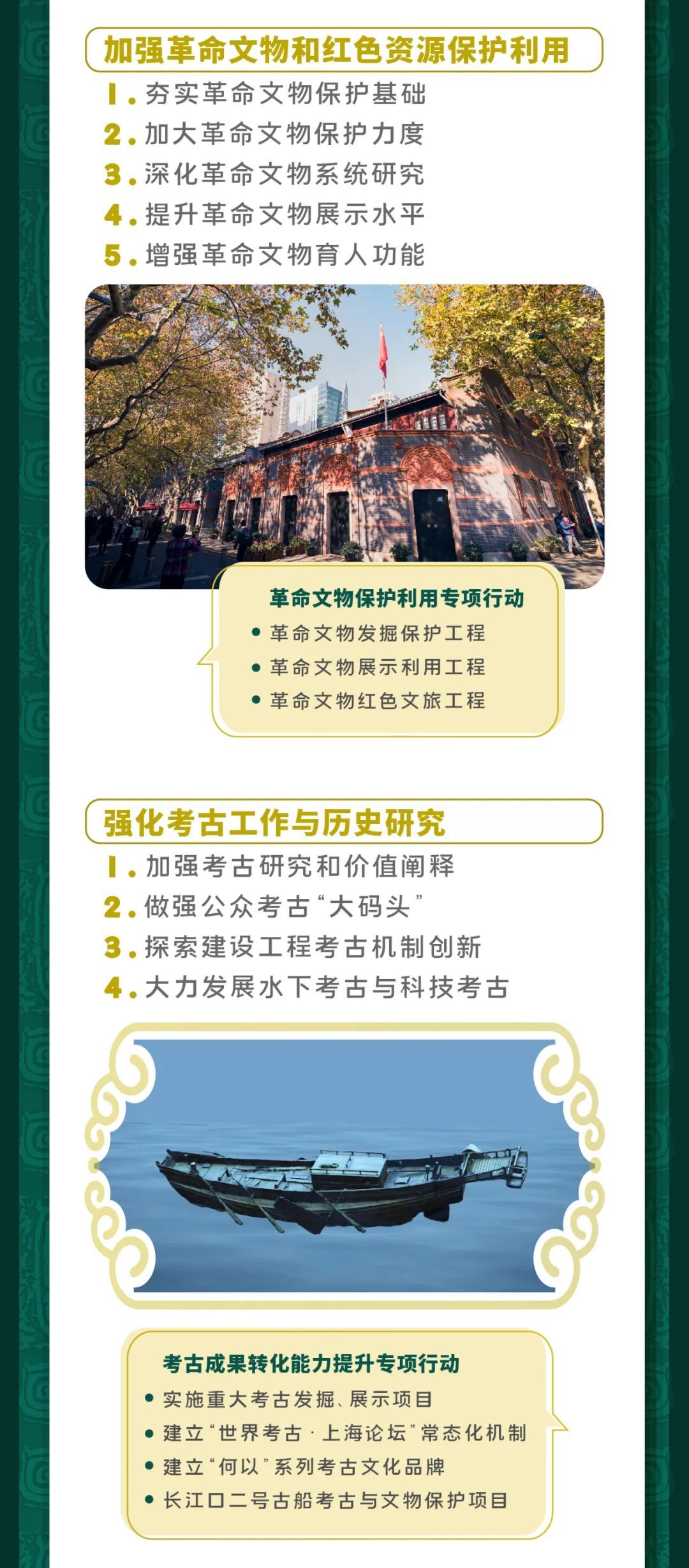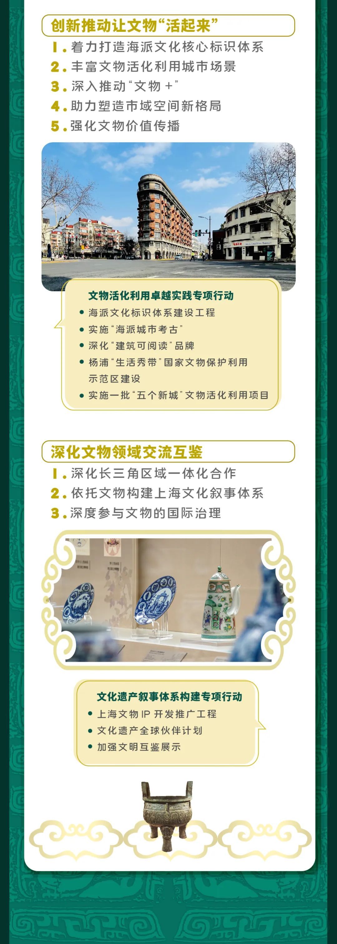 市文化旅游局出台了《上海市“十四五”文物保护利用规划》。《规划》指出到2025年,基本形成与上海建设具有世界影响力的社会主义现代化国际大都市地位相匹配的文物事业发展新格局。明确健全文物治理体系、提升不可移动文物保护能力、加强革命文物和红色资源保护利用等八大主要任务。具体详见↓