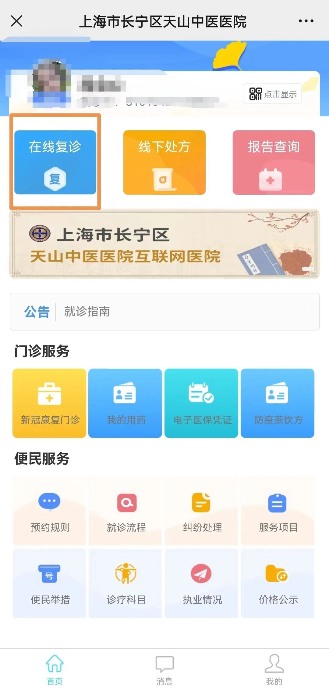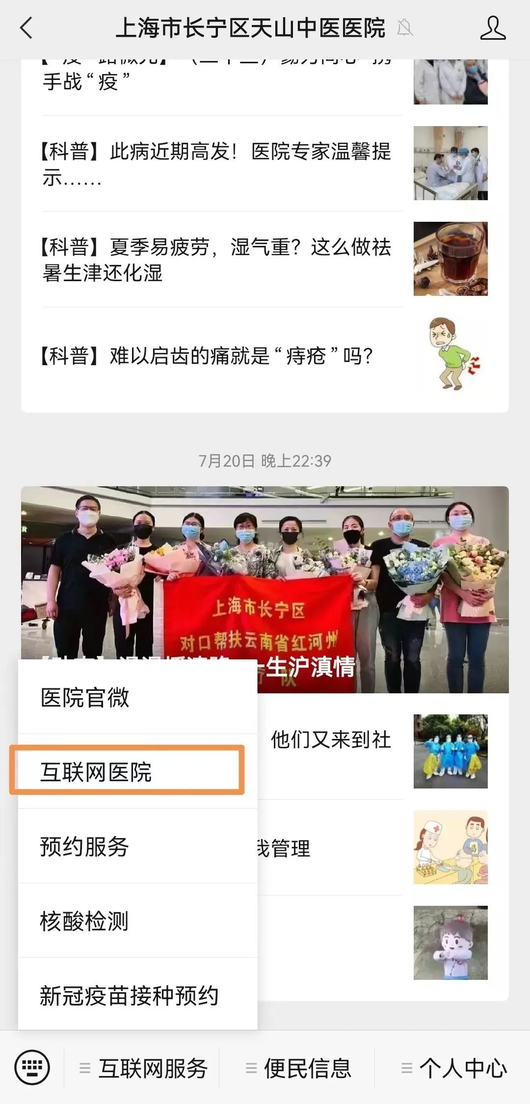 1、打开“上海市长宁区天山中医医院”微信公众号,在“互联网服务”栏中点击“互联网医院”