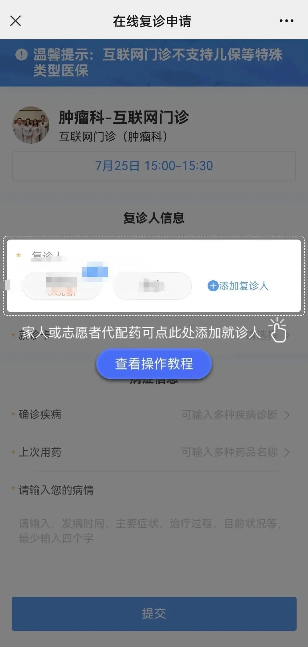 3、如果家人或志愿者代配药可点击“添加复诊人”,如有需要可查看操作教程