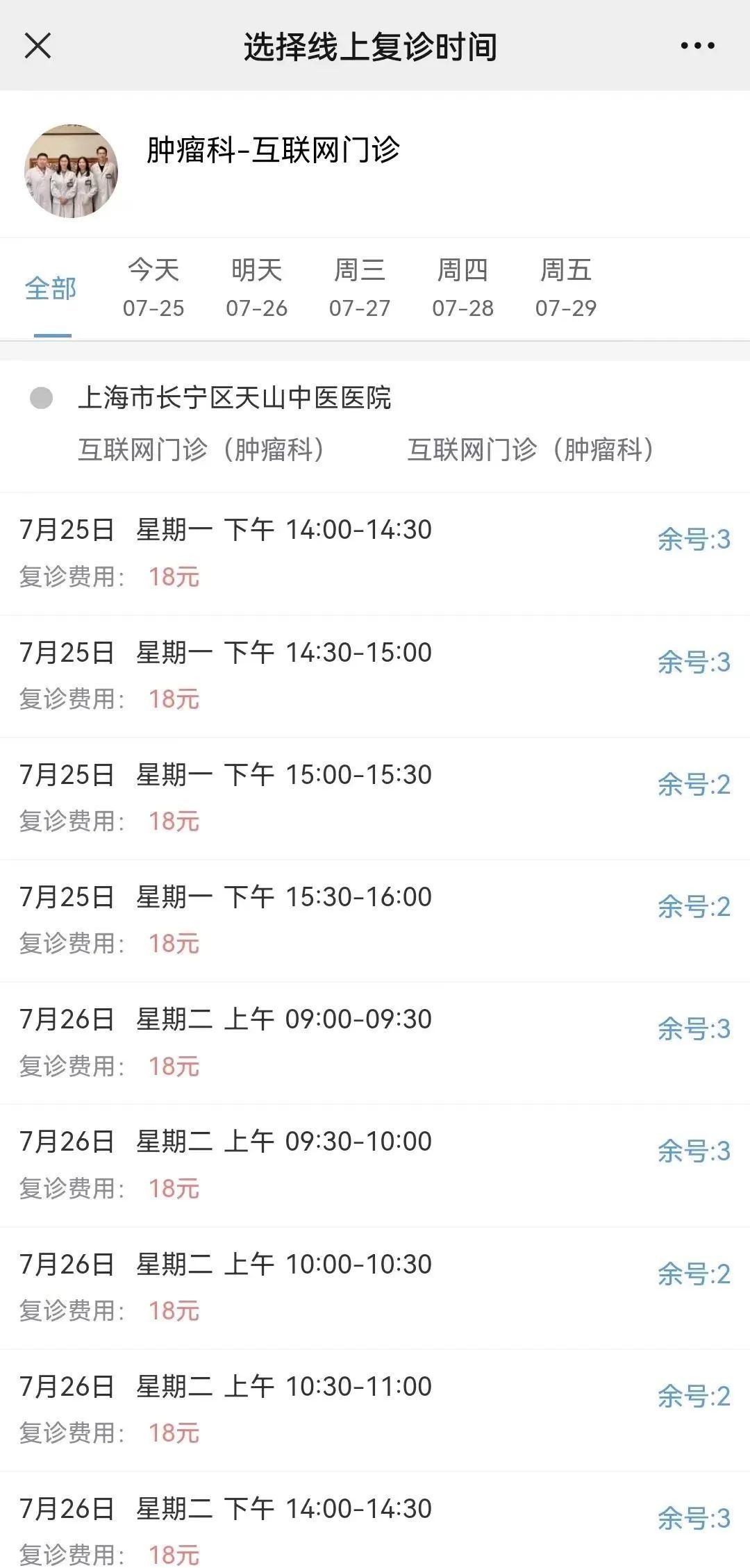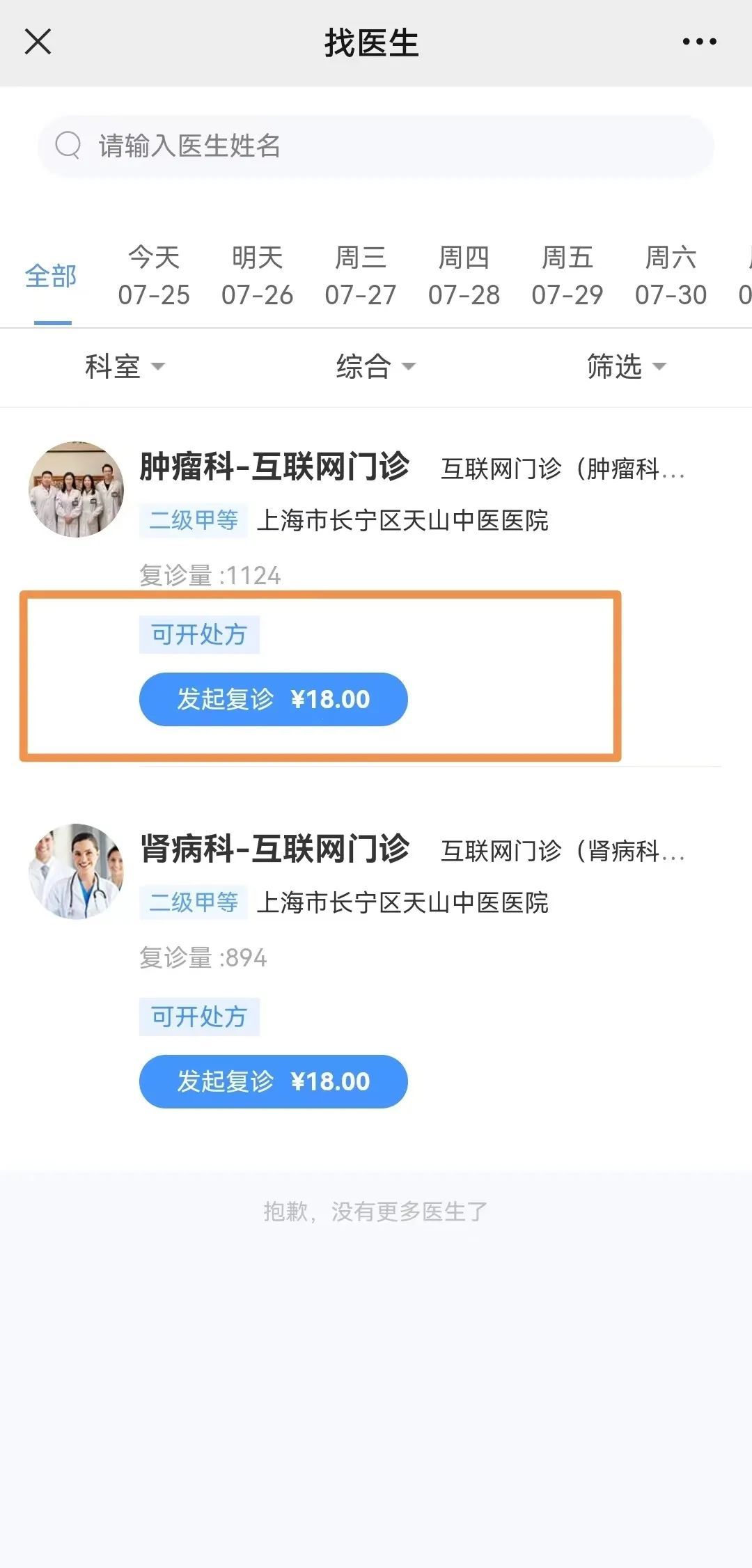 2、点击“在线复诊”后选择复诊科室及其时间(目前互联网医院只开放肿瘤科和肾病科)