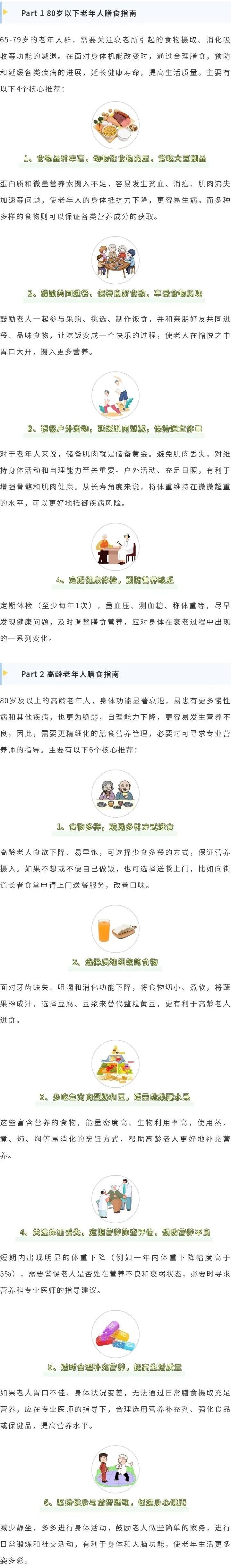 2022年5月中国营养学会发布的《中国居民膳食指南(2022版)》中,根据老年人群的特点,分别提出了针对一般老年人(65-79岁)和高龄老年人(80岁及以上)膳食营养核心推荐。