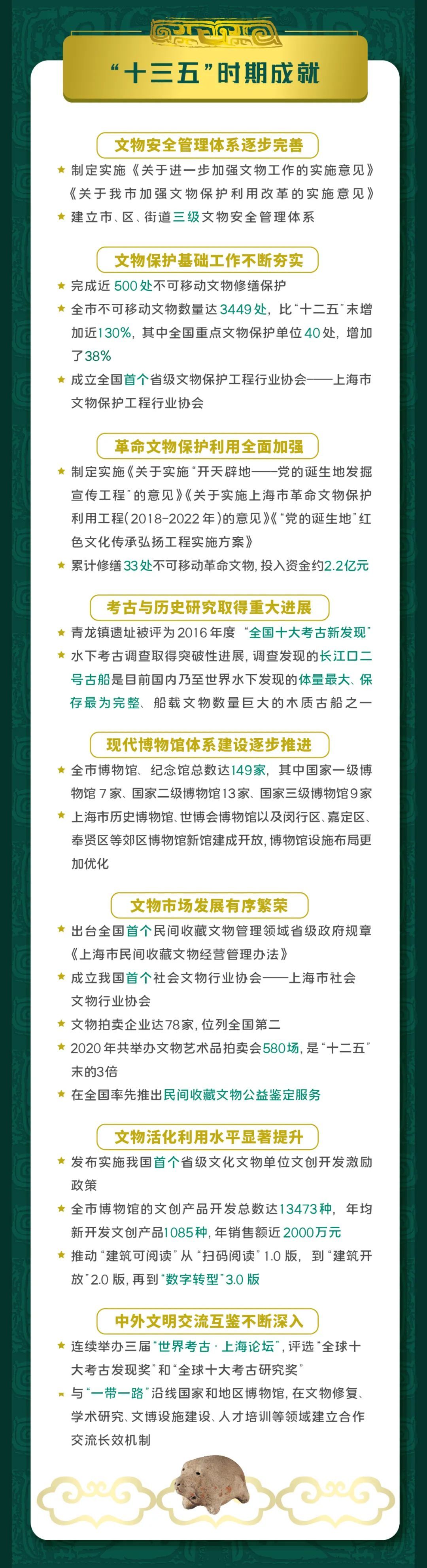 市文化旅游局出台了《上海市“十四五”文物保护利用规划》。《规划》指出到2025年,基本形成与上海建设具有世界影响力的社会主义现代化国际大都市地位相匹配的文物事业发展新格局。明确健全文物治理体系、提升不可移动文物保护能力、加强革命文物和红色资源保护利用等八大主要任务。具体详见↓