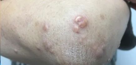 结节性黄瘤,始发于任何年龄,皮疹形态和大小各异,多为扁平或隆起的圆形结节,单发或多发,好发于膝和肘关节。