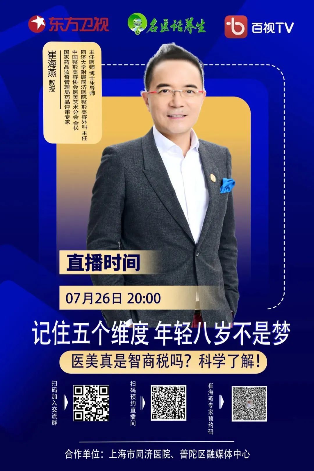 今晚八点同济大学附属同济医院整形美容外科主任、主任医师崔海燕教授,为大家介绍医美到底是不是智商税?整形外科到底看的什么病...?