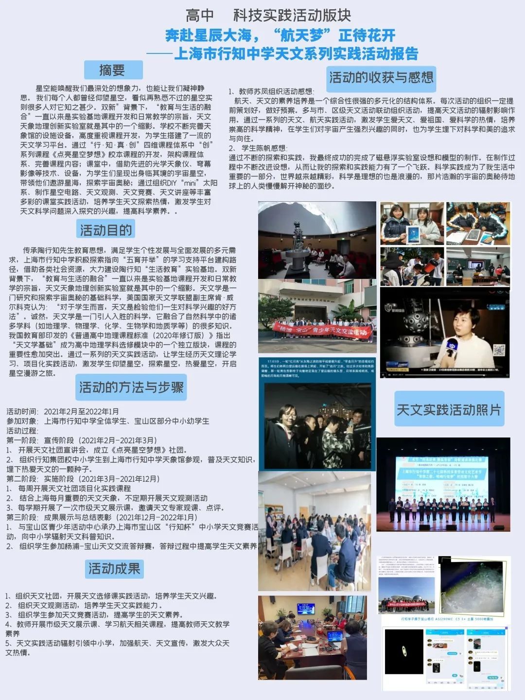 自2022年1月1日申报以来,上海市行知中学积极发动师生参赛,线下线上为学生进行课题辅导,组织各种科技活动,积极营造浓厚的科技文化氛围。积极培养学生的实践能力和创新素养,传承了陶行知先生“处处是创造之地,天天是创造之时,人人是创造之人”的创造教育思想。