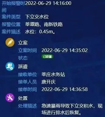以6月29日莘沥路、南新铁路下立交水位报警为例,立案11分钟即派遣养护人员接单处置,全程闭环处置。智慧水务应用场景实现自动报警、自动生成案例、自动推送、响应处置、结果反馈全流程管理。