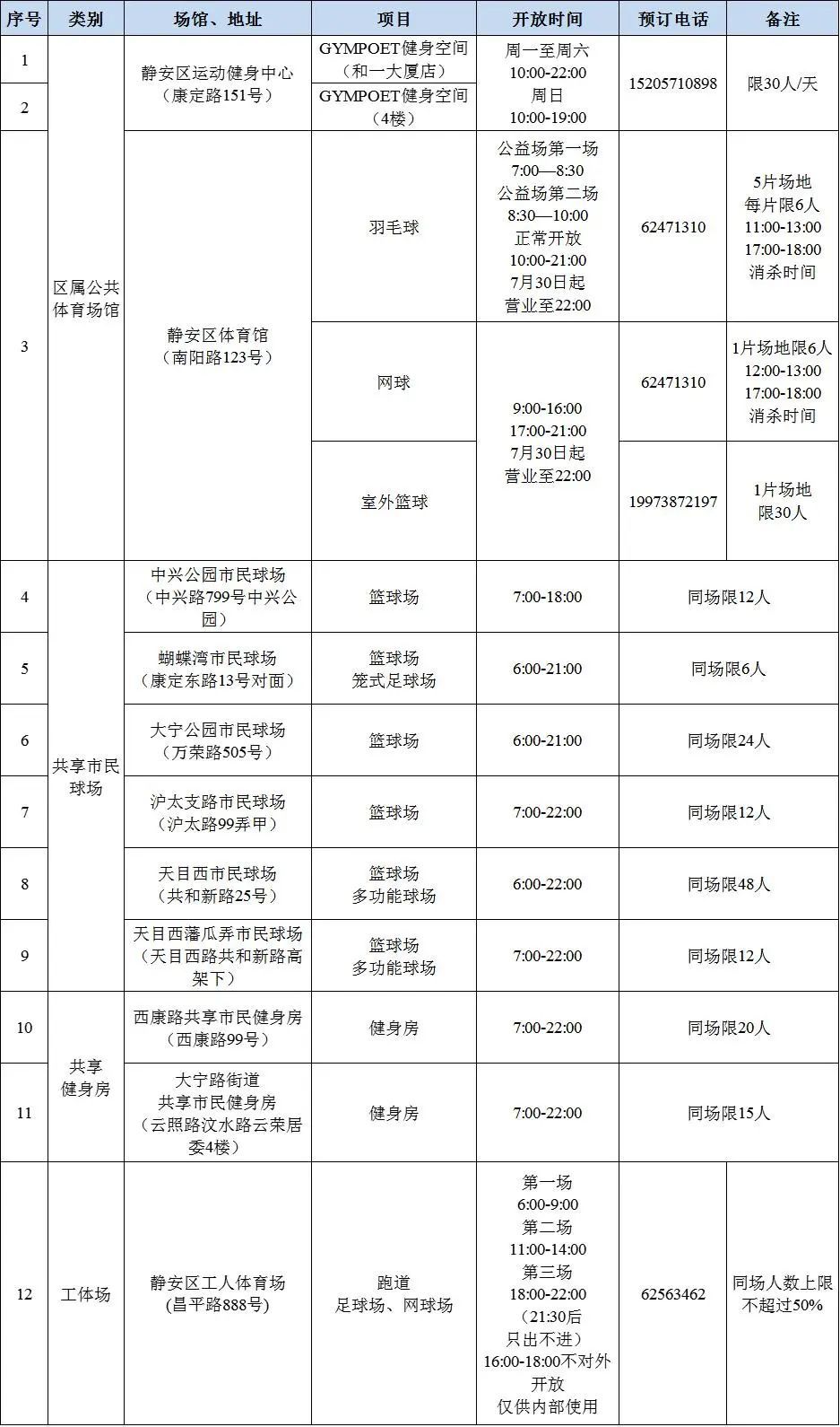 1.羽毛球馆公益场于2022年7月25日恢复开放,市民可在“静安体育综合服务平台”微信小程序或“静安体育”APP”进行线上预订。公益场开放时间:第一场7:00-8:30;第二场8:30-10:00。公益场开放场地5片,每片最多限6人。