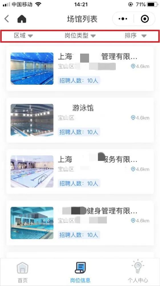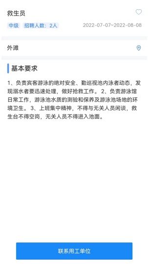 完善个人信息后,救生员可通过“岗位信息”一键获取场所的联系方式,可通过排序来查找,例如:按最近发布、按区、按等级要求等,提高查询效率。