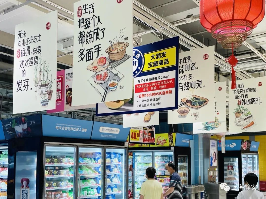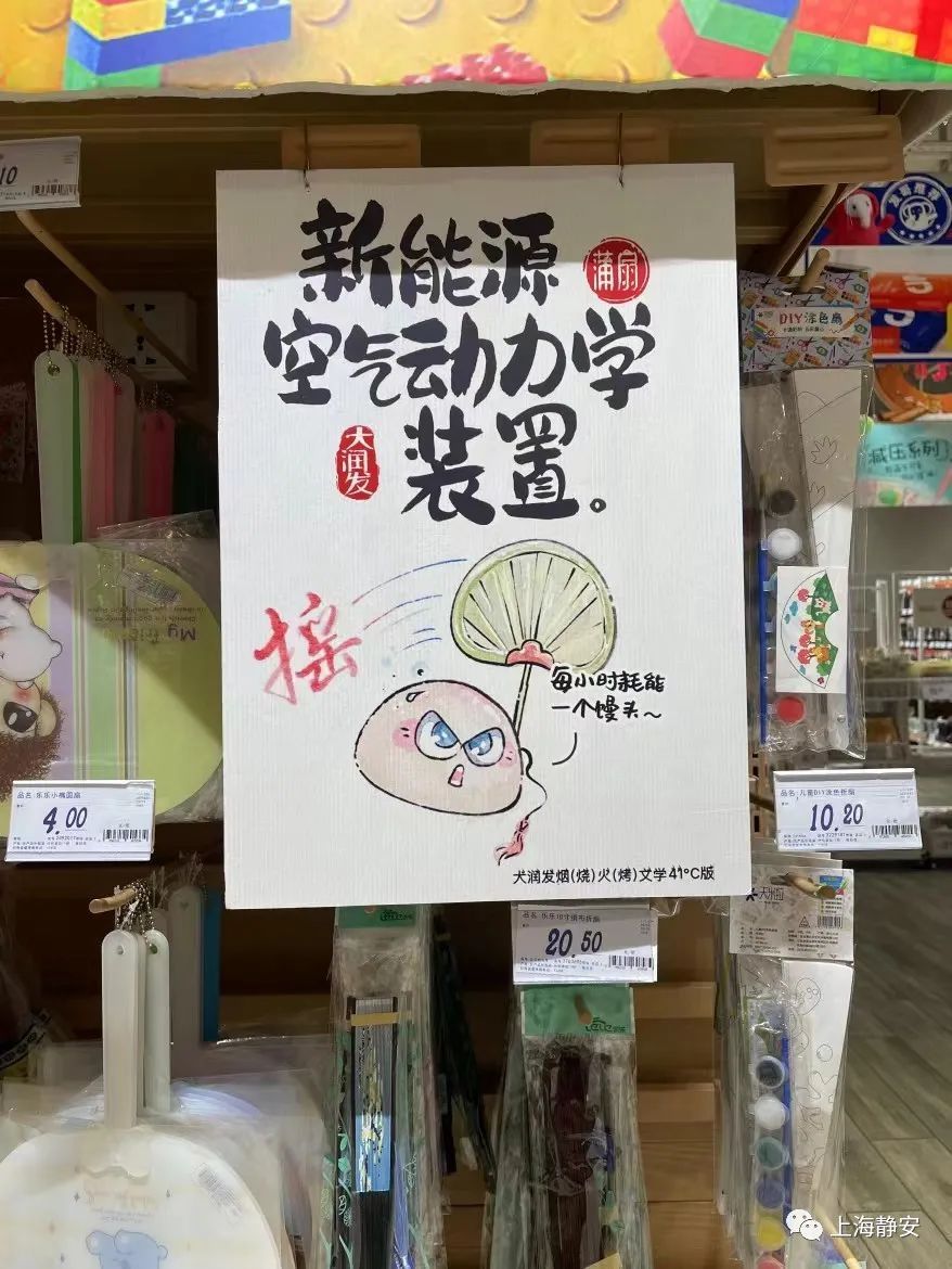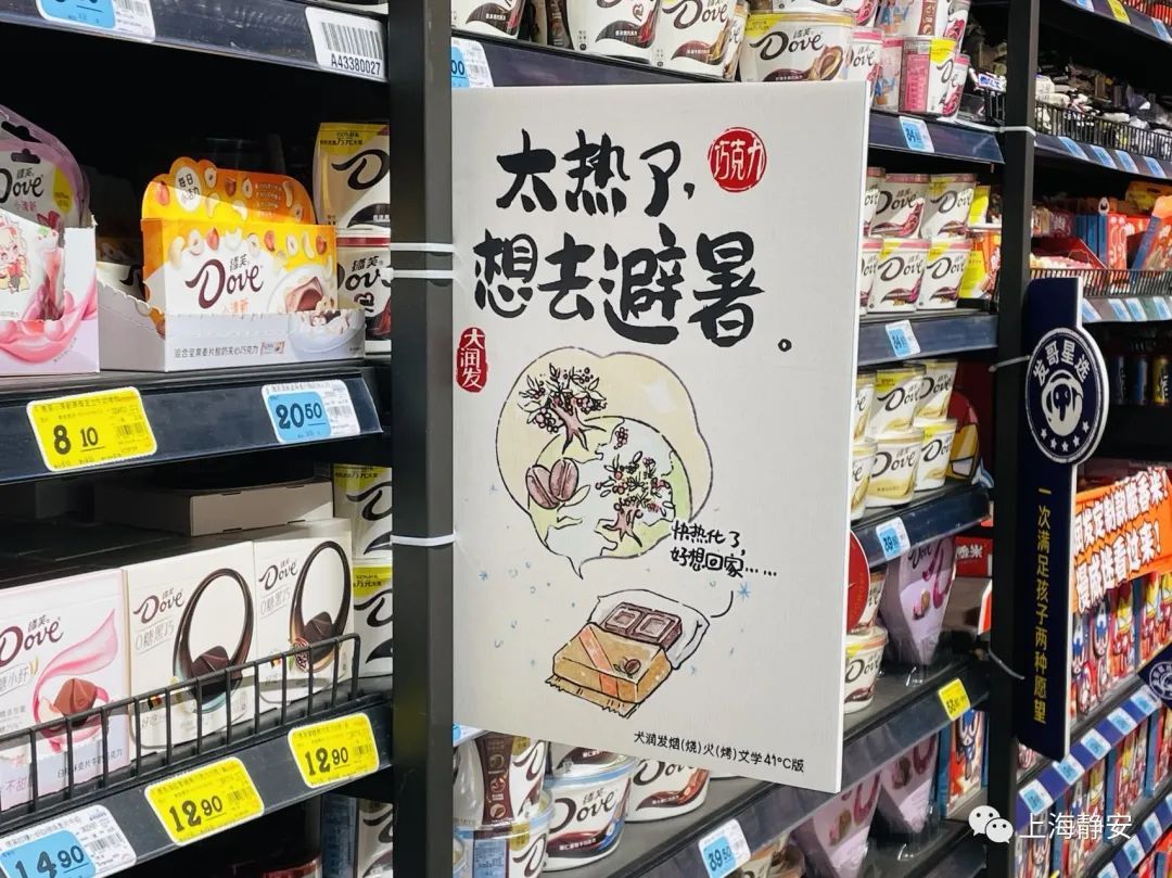 在大润发大宁店,当季热销的各类夏日商品纷纷用拟人化的口吻“调侃”着高温天,引发了网友的共鸣, “超市界最强嘴替,文案真都说到心坎上去了”。