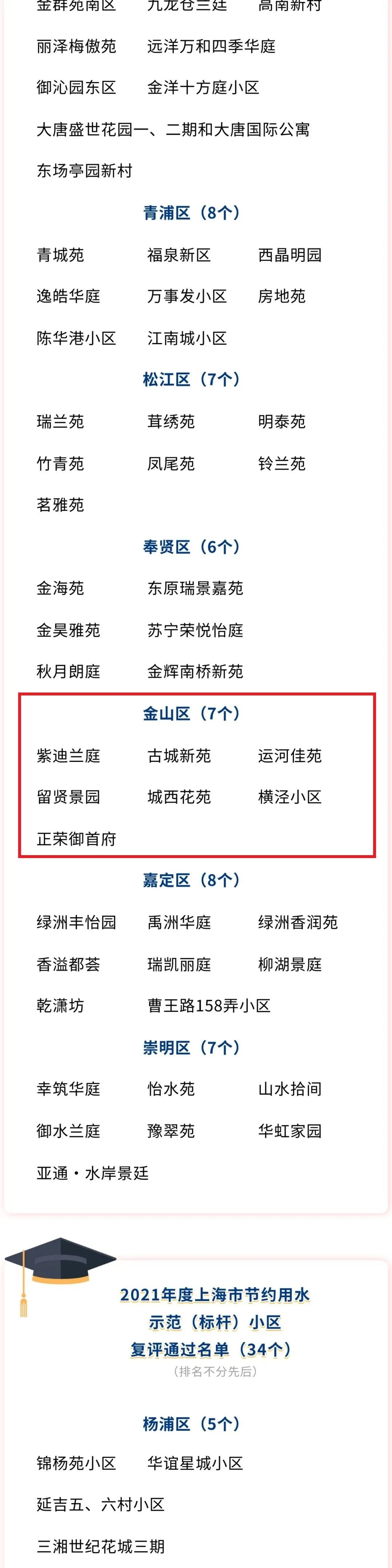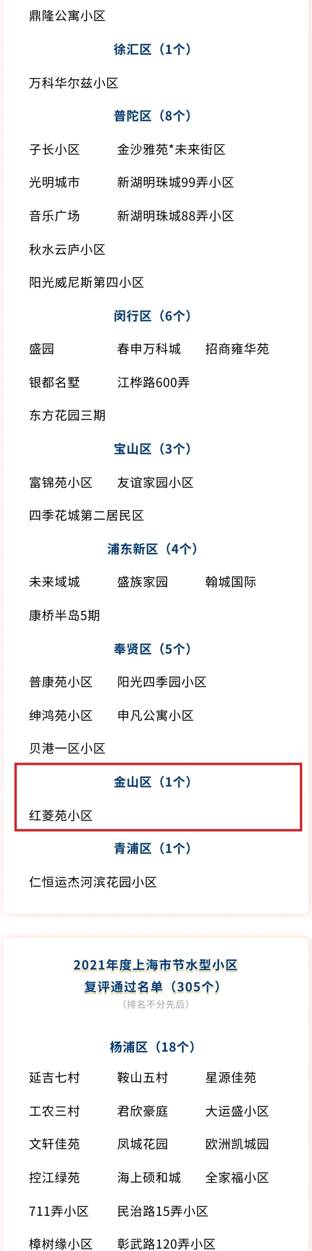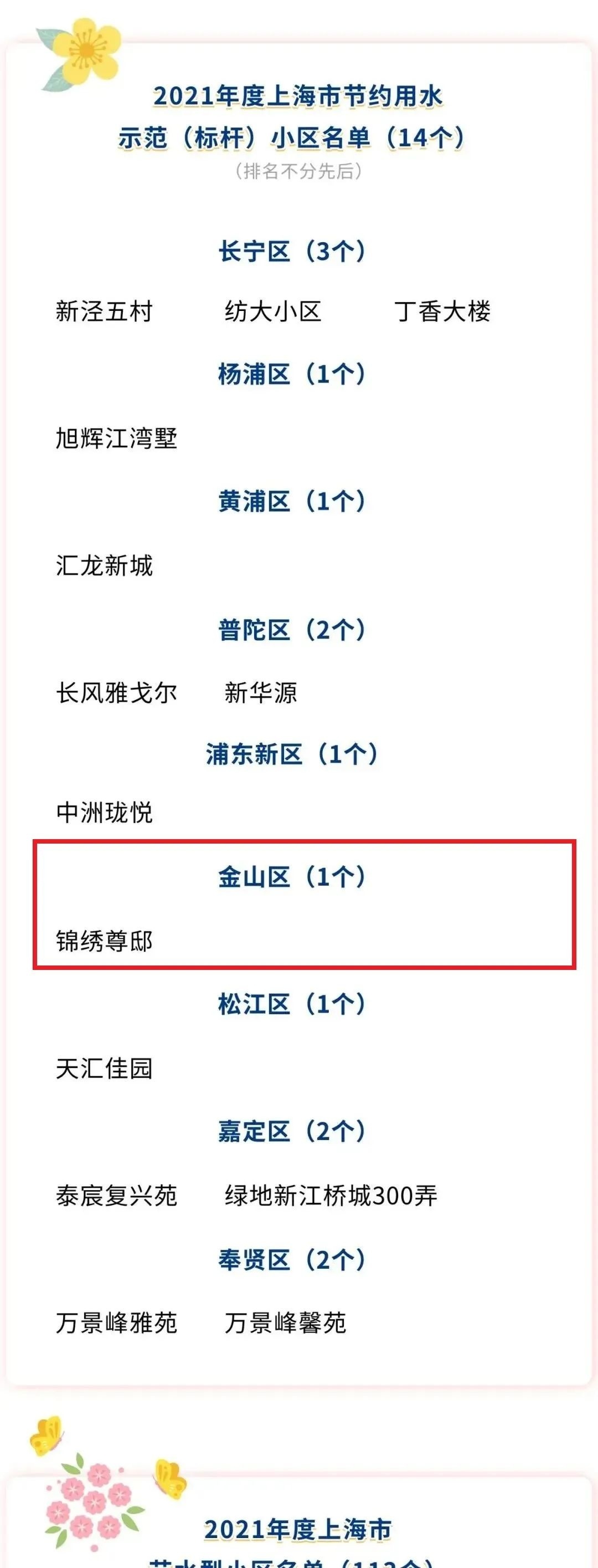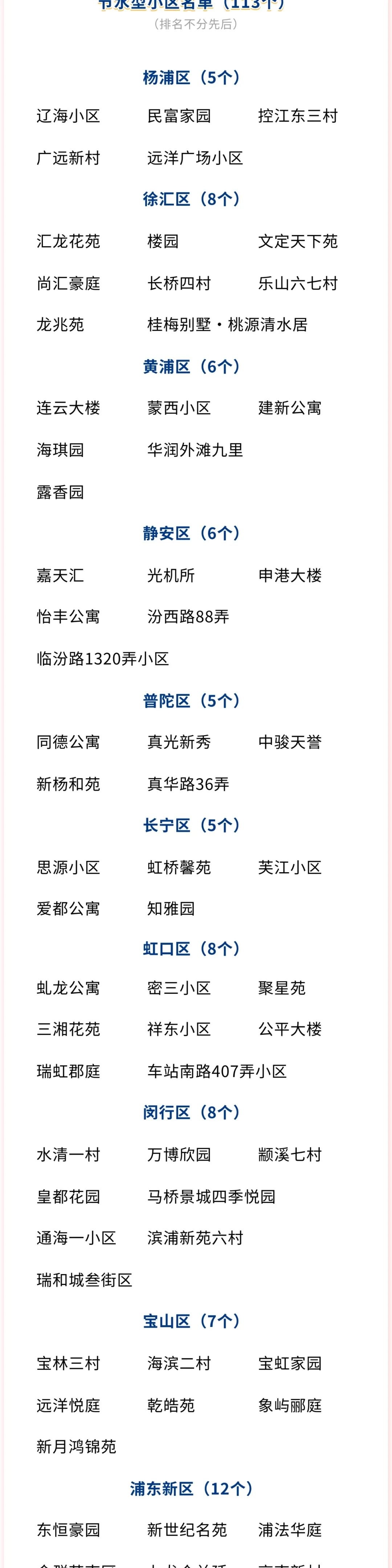 市水务局、市文明办在严格落实疫情防控要求的基础上,联合考评后决定,命名长宁区新泾五村等14个小区为2021年度上海市节约用水示范(标杆)小区;命名杨浦区辽海小区等113个小区为2021年度上海市节水型小区。同时,经评定,杨浦区锦杨苑小区等339家小区通过2021年度节约用水示范(标杆)小区或节水型小区复核,保留原有称号。名单详见↓