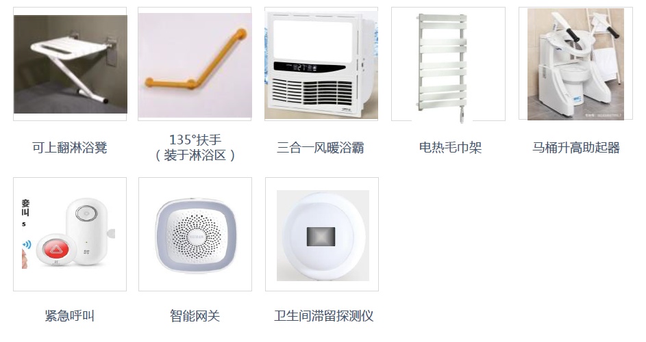 进入补贴范围内的适老化改造服务与产品,按玄关、卫生间、厨房、客厅、卧室、阳台、过道7大生活场景进行分类,共计60余项产品与服务供选择,涉及到老年人居家生活的方方面面,满足老年人居家养老的个性化需求。