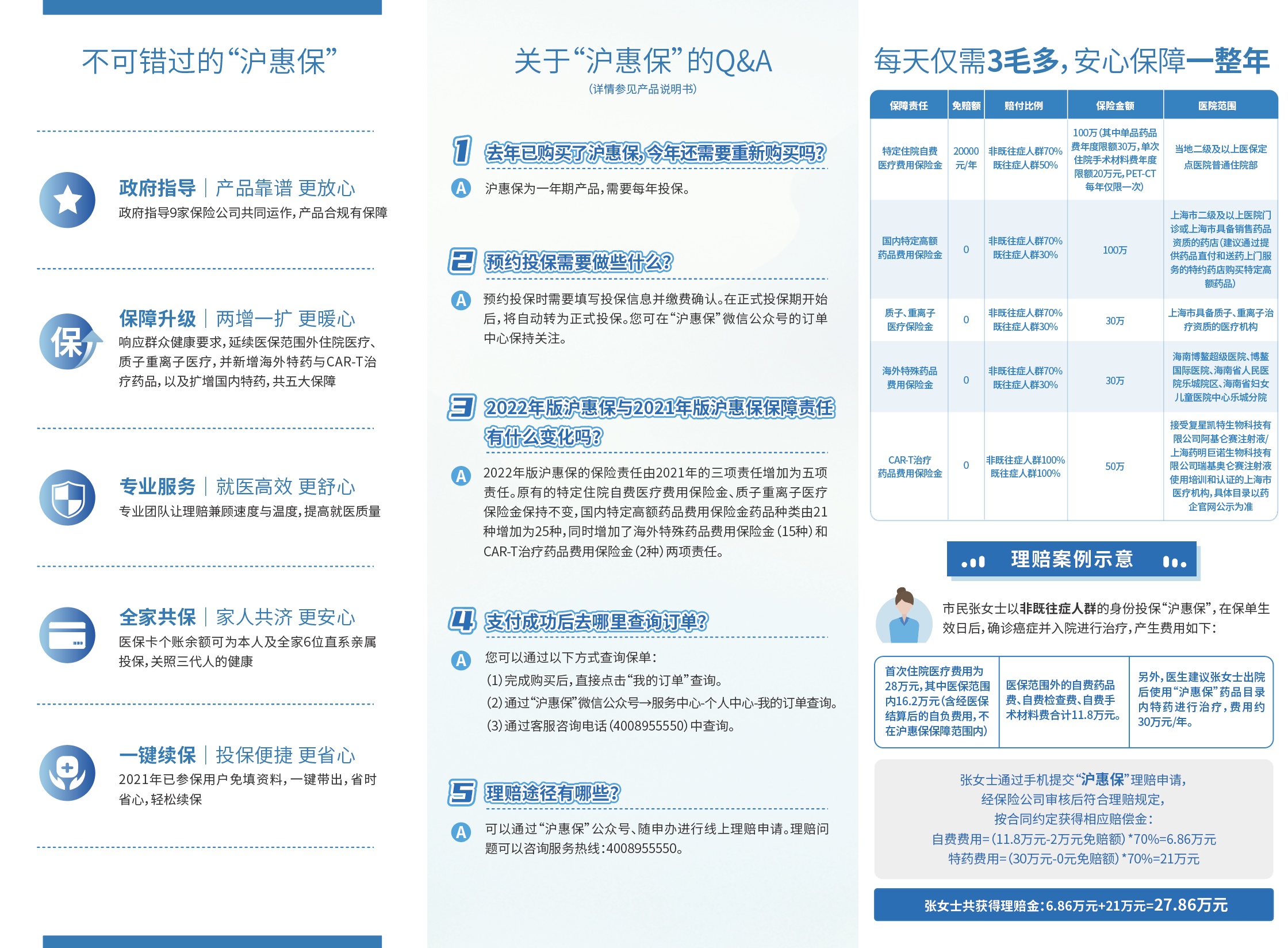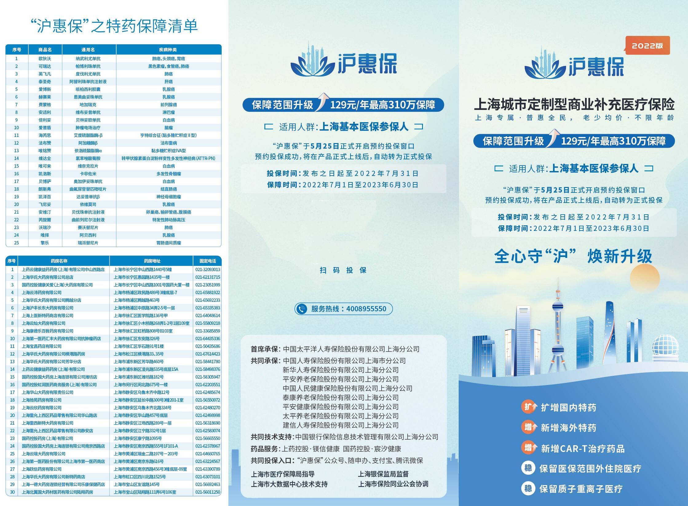 据了解,“沪惠保”是上海推出的首个普惠型补充商业保险,6月9日起,2022年度“沪惠保”正式开启参保,在2021年版基础上,保障升级,将CAR-T治疗药品和海外肿瘤特药纳入保障,保费为129元保一年,可获得医保范围外最高310万元的医疗保障。2022年度“沪惠保”投保延迟至7月31日结束,投保公司8月1日起可受理2022年度“沪惠保”理赔申请。市民可以通过“沪惠保”公众号、随申办进行线上理赔申请。
