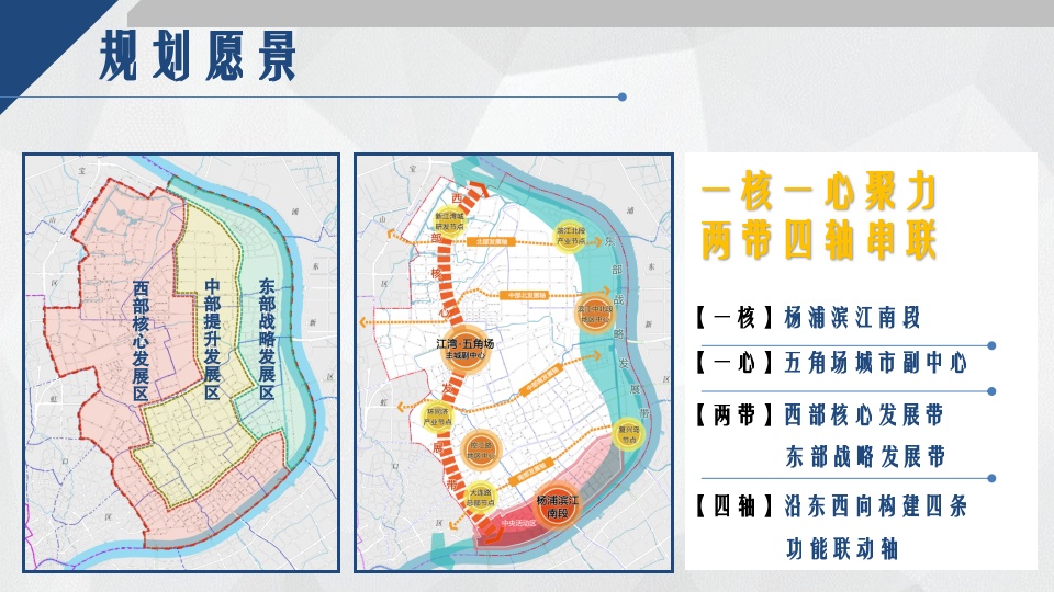 杨浦坚持以城区规划引领功能提升,规划在“西部核心区、中部提升区、东部战略区”三大空间战略分区的基础上,构建“一核一心聚力,两带四轴串联”的空间结构。其中“一核”指杨浦滨江南段,“一心”为五角场城市副中心,“两带”分别为位于淞沪路、四平路、大连路沿线的“西部核心发展带”及东侧沿黄浦江的“东部战略发展带”,沿东西向构建四条功能联动轴。