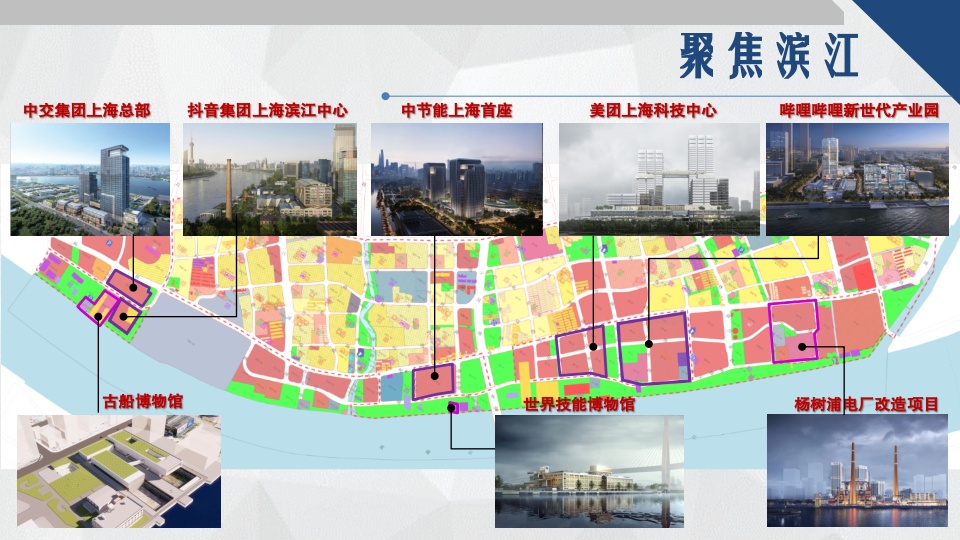 目前正在加快推进美团上海科技中心、哔哩哔哩新世代产业园、抖音集团上海滨江中心、中交集团上海总部、中节能上海首座等一批功能性项目建设,长阳秀带在线新经济生态园总部秀园初具规模。世界技能博物馆、古船博物馆、杨树浦电厂改造项目等,将工业遗产更新后注入文化功能的重点项目也已启动开发建设。