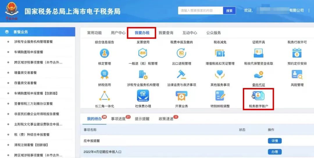 全电发票试点纳税人,登录【上海市电子税务局】,点击【我要办税】→【税务数字账户】进入【电子发票服务平台】;