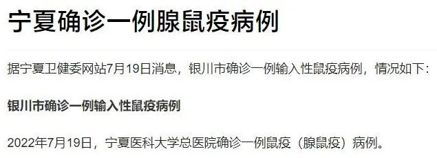 据宁夏卫健委官网消息,7月19日,宁夏医科大学总医院确诊一例鼠疫(腺鼠疫)病例。