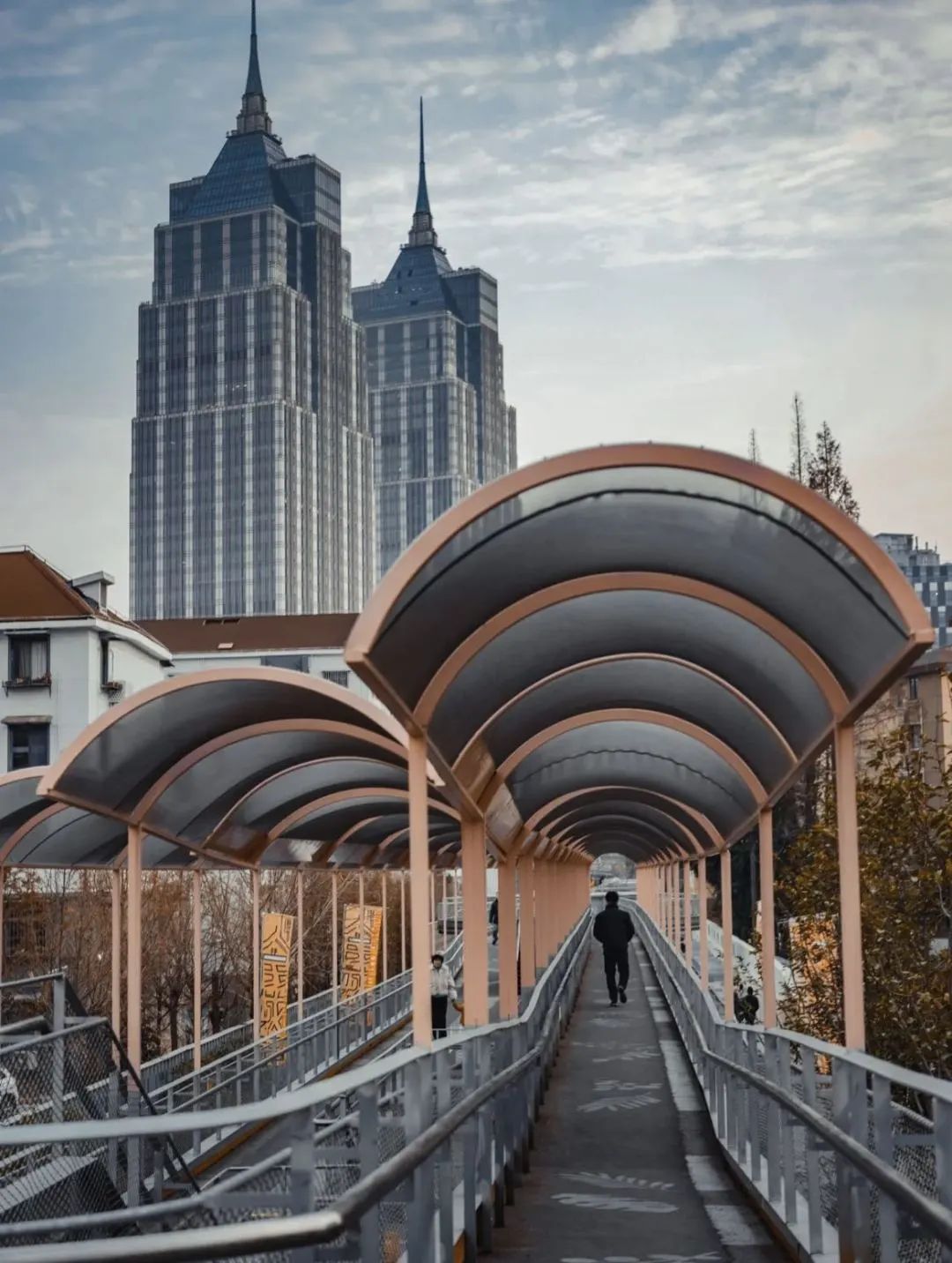 百禧公园作为一座高线公园,站在桥上,恰好可以将环球港的双塔尖收入眼底,暖色的公园与冷色的大楼形成一种“反差酷”。