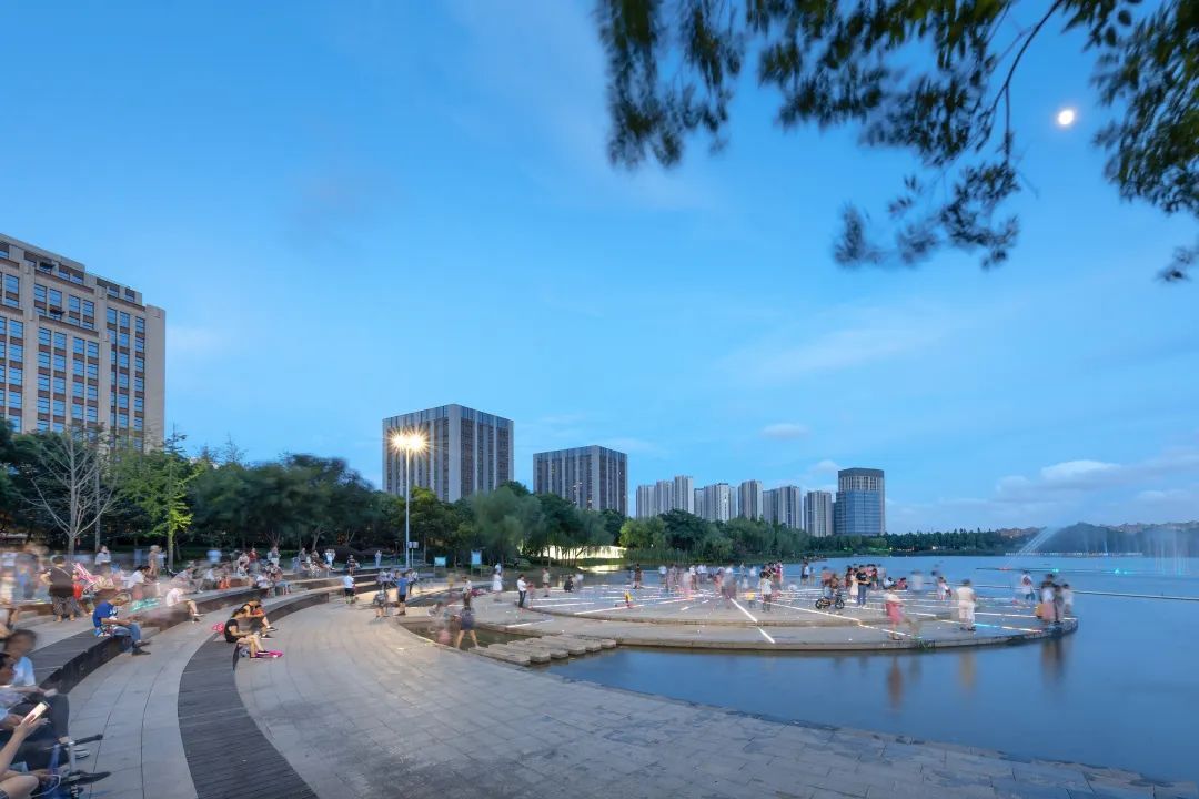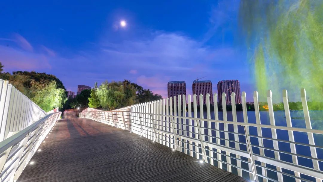 滨水步道、观景平台、木栈道、桥梁、湿地等元素贯穿整个公园核心区,在树与水的交叉、林与岛的融合中,描绘出城市与自然共生共融的景观形态。