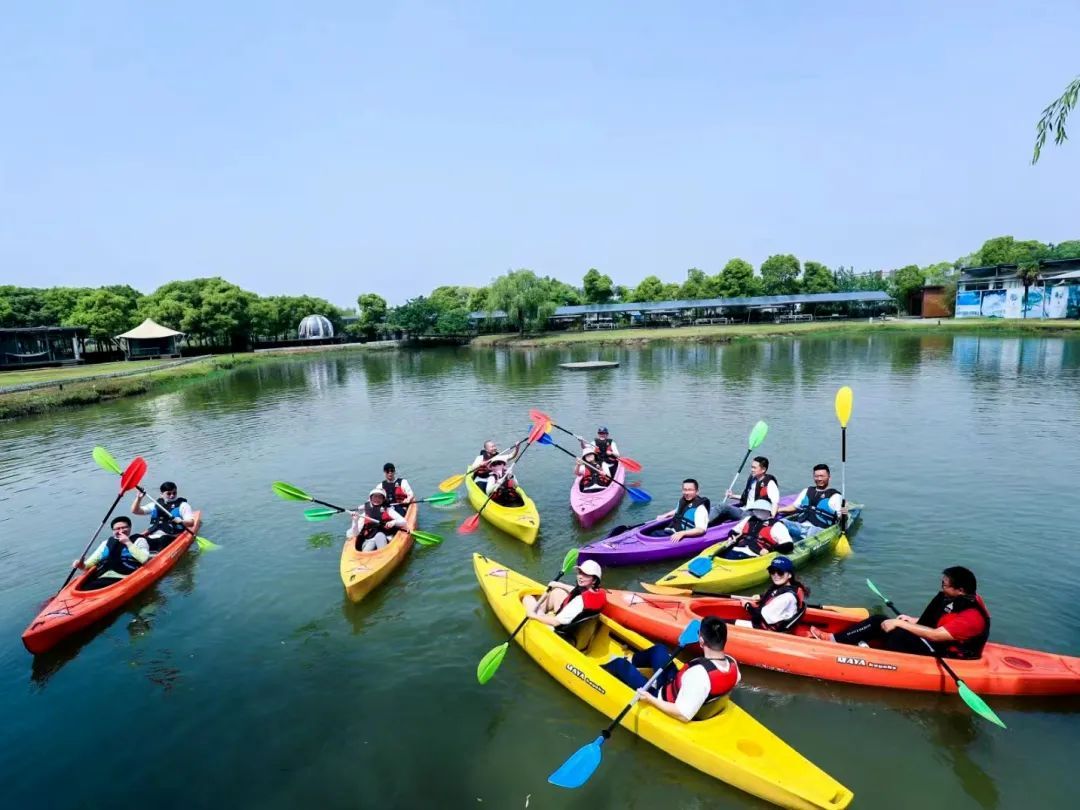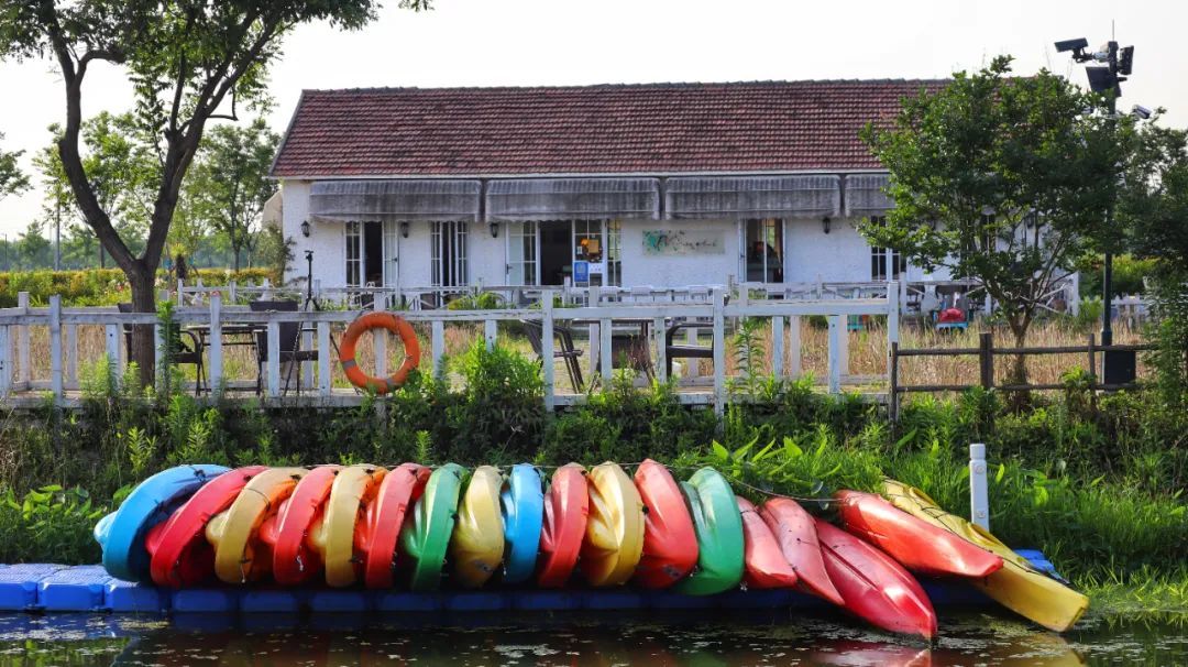 颜色鲜艳的“小船”点缀在波光粼粼的水面上,非常吸引眼球。在游客体验皮划艇项目之前,专业教练会先教授正确的划桨方法和相关注意事项。游客下水摸索一番后,就能驾驶皮划艇在乡村河流上一路前行,开启一片由自己掌控的水上世界。