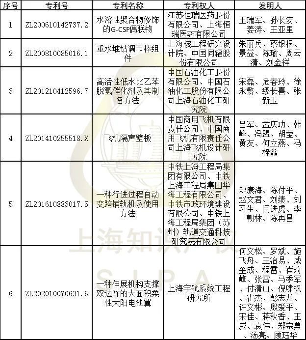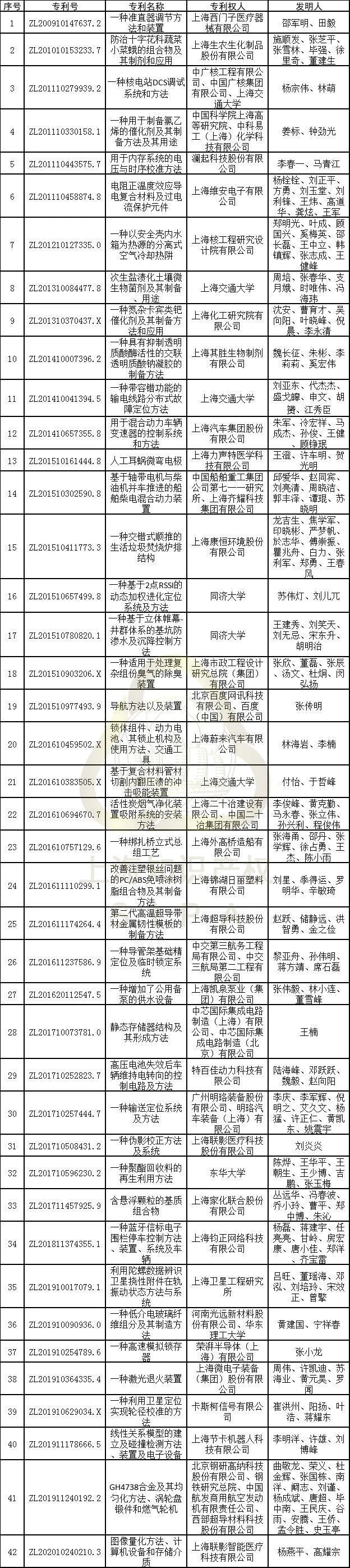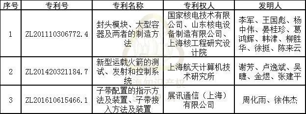 近日,国家知识产权局公布第二十三届中国专利奖结果,上海共有54项专利入围获奖项目。其中,3项专利获中国专利金奖,分别为:上海航天计算机技术研究所的“新型运载火箭的测试、发射和控制系统”、上海核工程研究设计院等单位的“封头模块、大型容器及两者的制造方法”、展讯通信(上海)有限公司的“子带配置的指示方法及装置、子带接入方法及装置”专利项目。1项专利获中国外观设计金奖,为中国商用飞机有限责任公司等单位的“飞机(宽体)”专利项目。上海市知识产权局获得中国专利奖最佳组织奖。