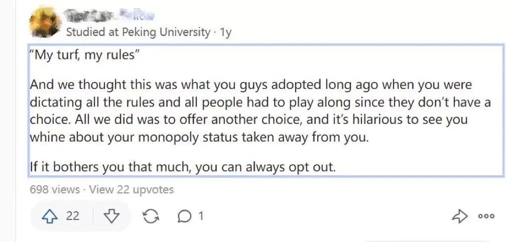“我的地盘,我的规则。”我们知道这是你们很久以前采用的,当时你们制定所有规则,所有人都必须配合,因为他们别无选择。我们(中国)所做的只是提供另一种选择。看到你抱怨你们的垄断地位被剥夺了,这很有趣。如果这种状况让你感到困扰,你可以随时选择退出。