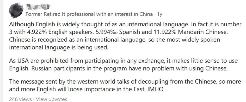 一位标注为对中国感兴趣的退休互联网员工讨论了中文在国际社会的重要性。