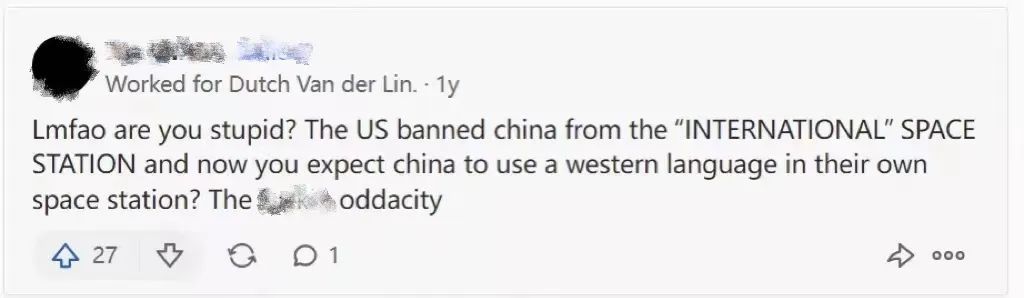 一位网友指出美国的双标行为:“你傻吗?美国禁止中国进入‘国际’空间站,现在你希望中国在自己的空间站使用西方语言?有毛病吧!”