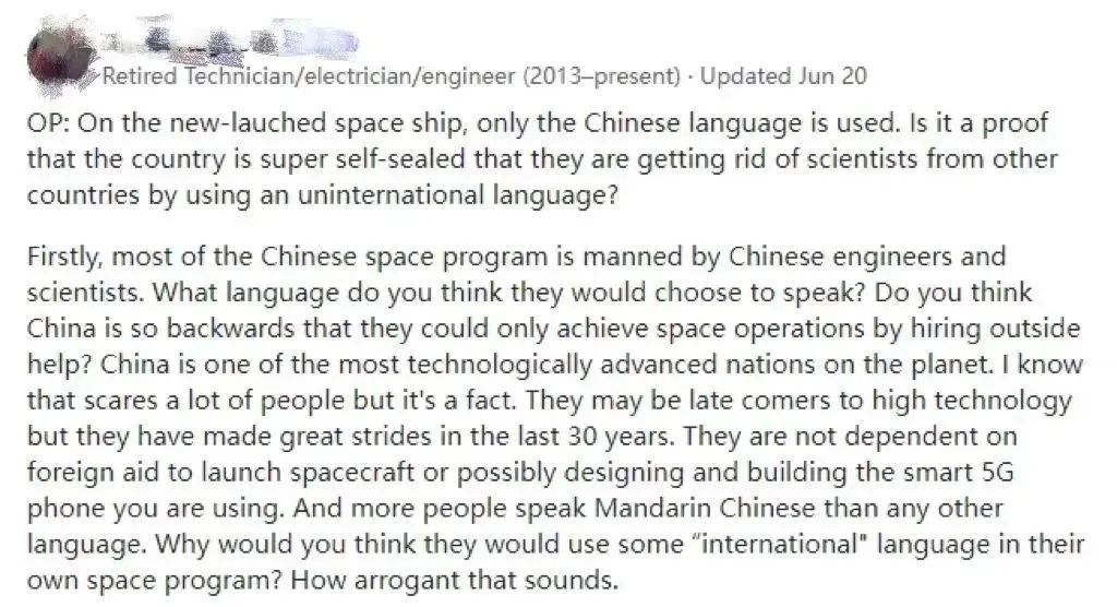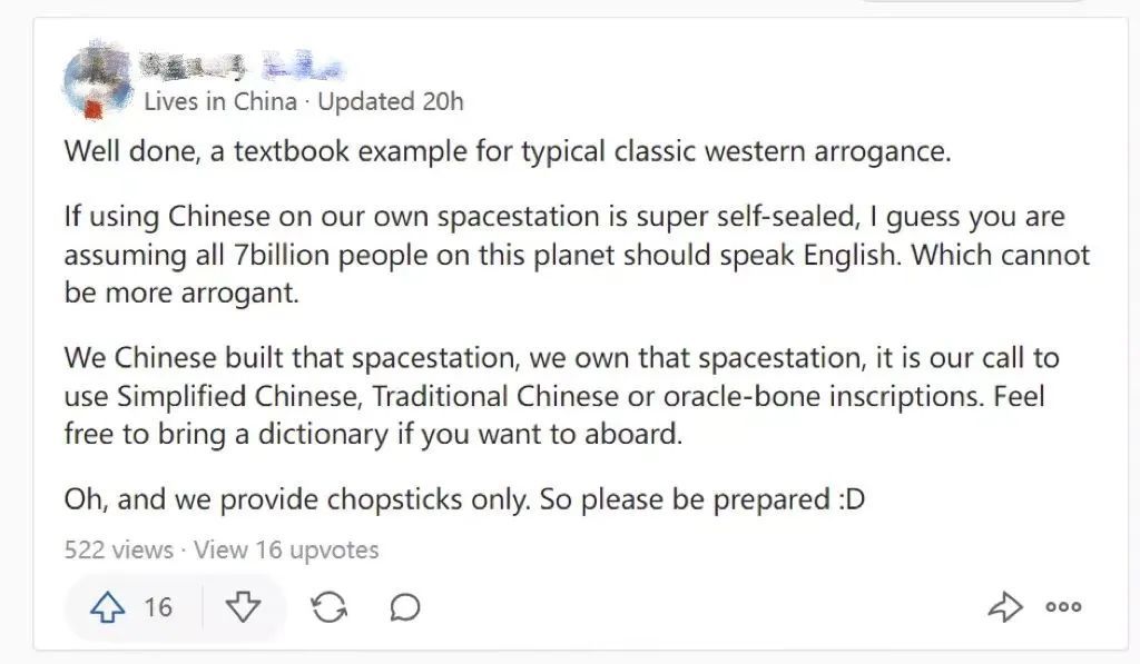 有一位博主提问称:在新发射的太空船上只使用中文,这是否说明这个国家超级自我封闭,他们正在通过使用一种非通用语言来摆脱来自其他国家的科学家?没想到的是,在帖文下方的留言板里,回复几乎是一边倒地支持中国!