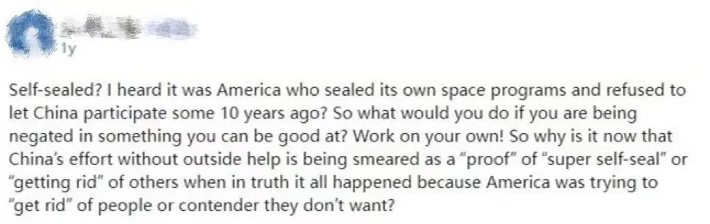 还有一位网友对博主所提到的“自我封闭”提出了反驳:“我听说是美国在10年前封闭了自己的太空计划,并拒绝让中国参与?所以,如果你擅长的事情被否定了,你会怎么做?独立工作!那么,为什么现在中国在没有外界帮助的情况下的努力,被抹黑为‘超级自我封闭’或‘摆脱’他人的“证据”?实际上这一切都是因为美国试图‘摆脱’他们不想要的人或竞争者所造成的。”