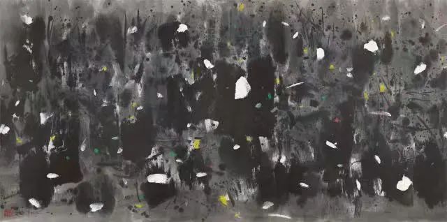 作品以抽象的形式描绘了野外花草的视觉景象。整幅画面以水墨渲染作为背景,墨色层次变化丰富,意境幽深。画幅上还以白色及其他色点点染,自然随意,在深色背景下显得格外明快,并且与底色中的淡墨形成呼应。